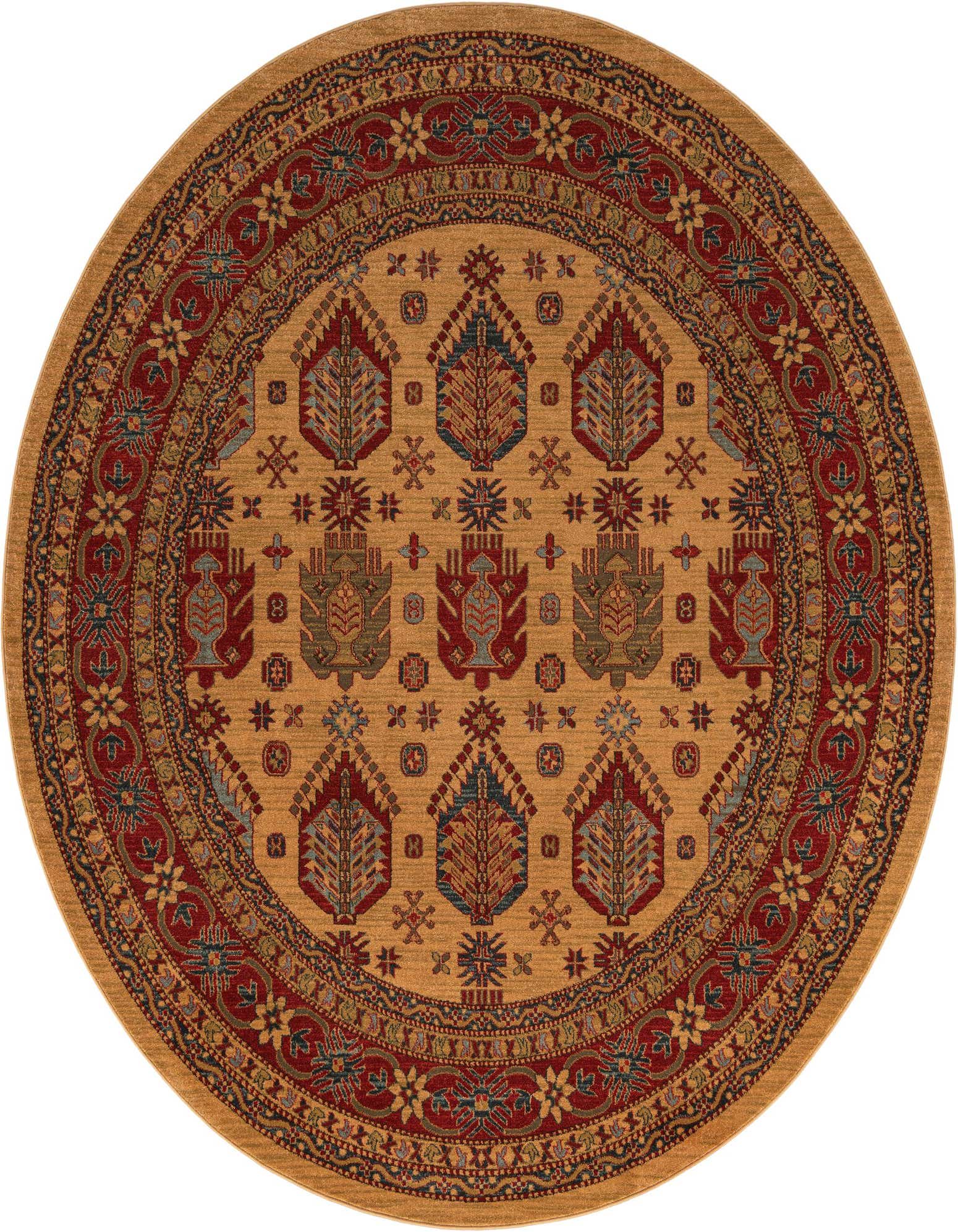 The Sara Collection presents a meticulously machine-woven 8 Ft round rug crafted from 100% polypropylene, ensuring durability and a shed-free experience. This piece boasts a traditional design, rich with a blend of beige as its foundational color, enhanced by a harmonious symphony of light blue, light brown, light green, blue, brown, and red accents that create an intricate and engaging pattern.