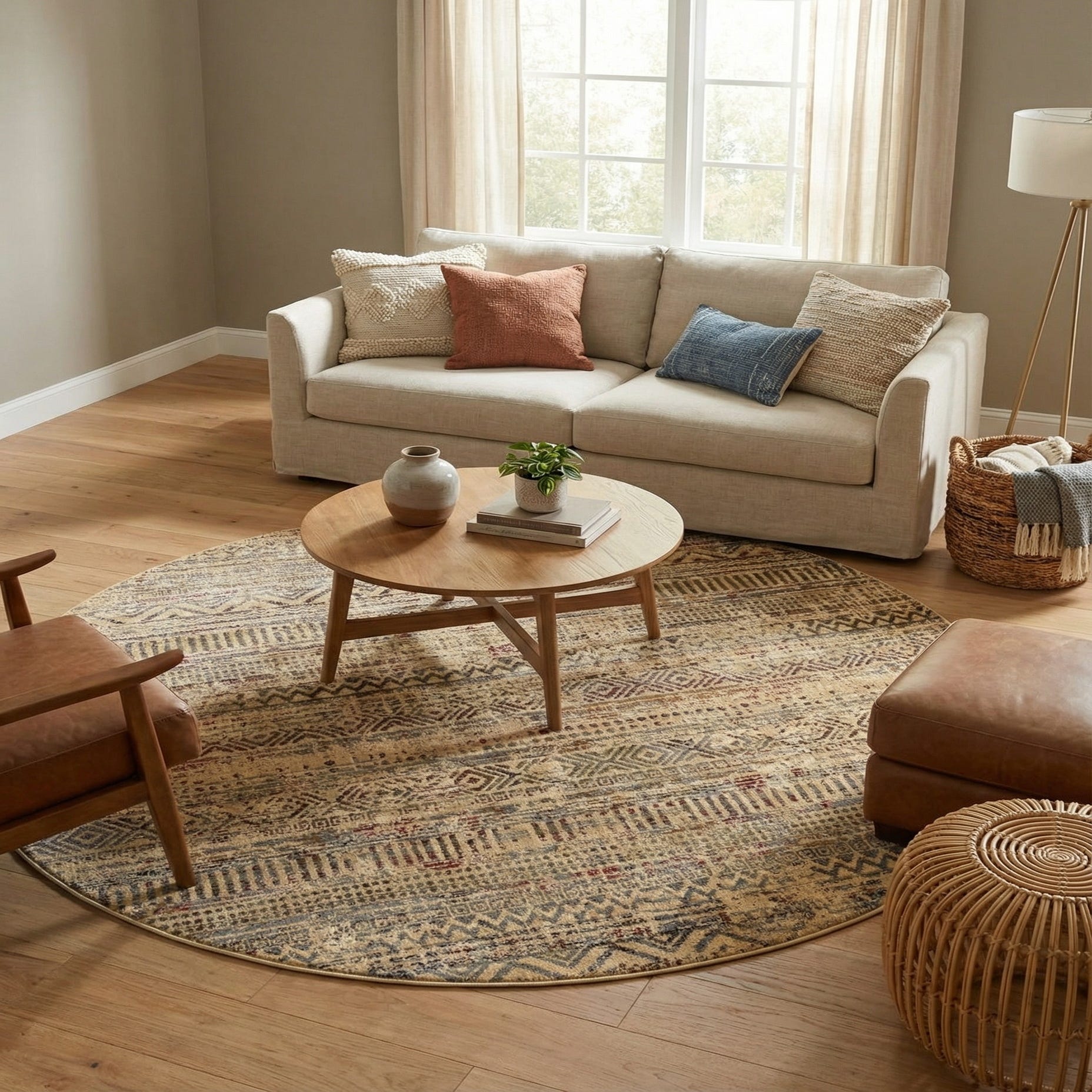 Machine-made of polypropylene, the rug has a low, even pile that feels smooth and slightly springy underfoot. Its round shape makes it a natural anchor for circular or grouped furniture arrangements: place it beneath a round dining table or a coffee table to define a seating area, layer it under a bed to soften hard floors, or use it in a home office or entryway to introduce pattern and warmth. It pairs well with natural wood furniture, leather seating, olive or charcoal upholstery, and metal accents in brass or matte black for a relaxed, layered look.
