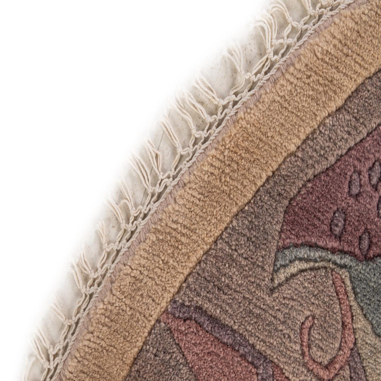 A round, high-pile wool rug featuring a solid tan center and a wide border with abstract Oriental patterns in muted browns, tans, ivories, and creams, with fringe.