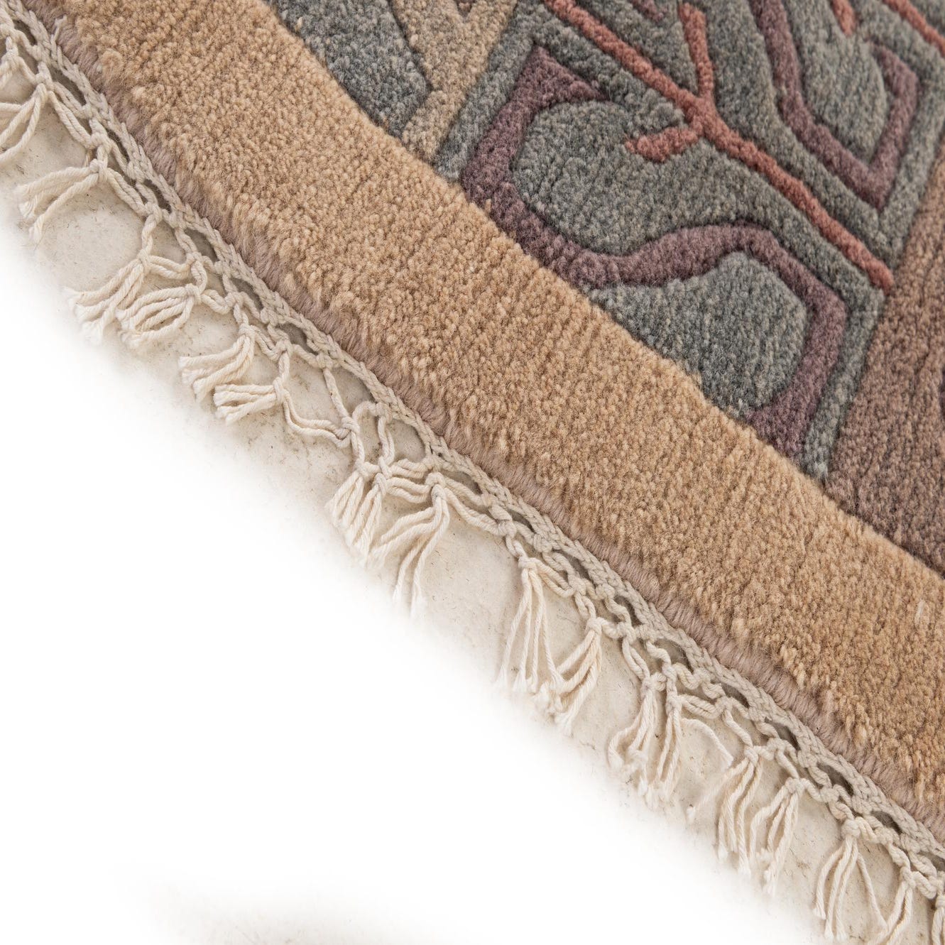 A warm beige field anchors this round rug, giving it a calm, neutral base that lets the patterned border take center stage. A broad ring of abstract panels encircles the center, rendered in muted blue, violet, purple and pink tones that layer soft color and subtle movement. The border’s organic shapes and linear details create visual interest without competing with surrounding furnishings, while a short fringe finishes the edge for a tailored, handcrafted look. Hand-knotted in 100% wool, the pile has a dense, velvety hand that feels soft underfoot and shows a gentle, low sheen when light hits the surface.