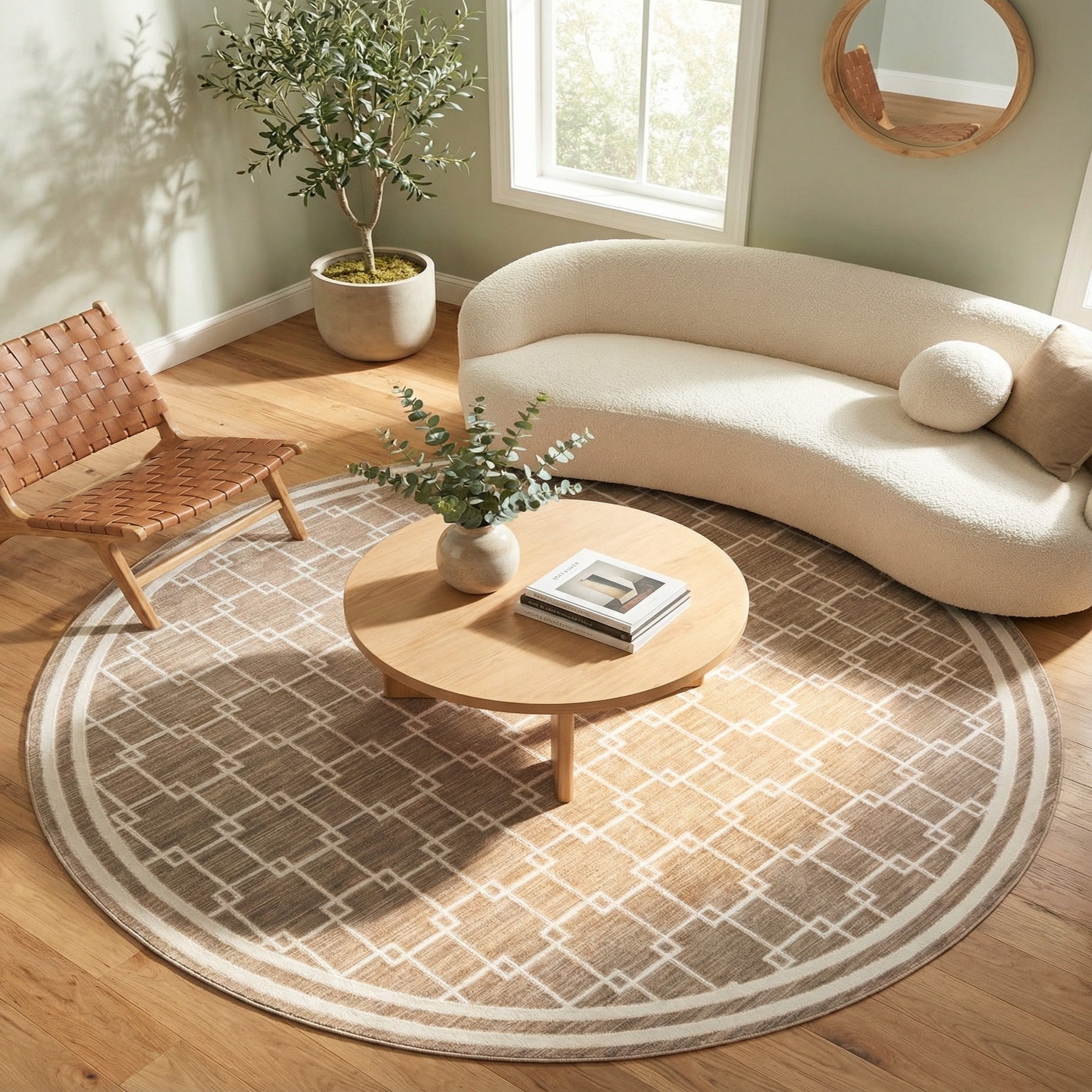 A warm beige field anchors a crisp ivory geometric lattice across this round rug, creating a balanced look that feels both modern and subtly classic. The pattern of interlocking squares and the concentric double-ring border add structure without overwhelming the eye, while fine linear striations in the background give the surface visual depth. The neutral beige background and ivory accents make it easy to pair with a range of color schemes.