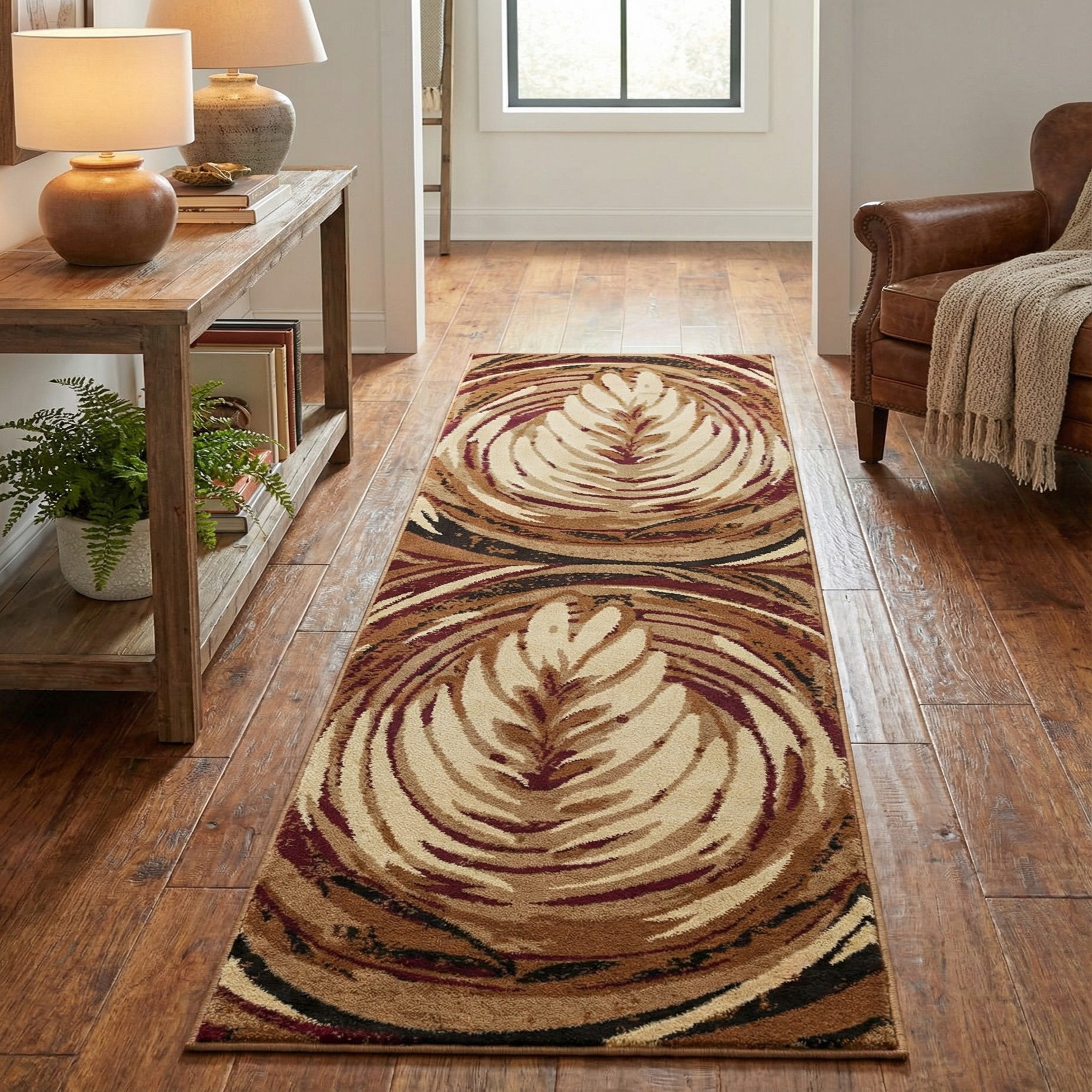 This Cafe collection runner rug features a dynamic abstract pattern with swirls that create a sense of movement on the floor. The color palette includes beige, brown, burgundy, cream, light brown, and maroon, with a beige background that provides a neutral base for the bolder accents. Made from 100% polypropylene, this machine-woven rug is designed to be both stain-resistant and shed-free, ensuring durability and ease of maintenance.