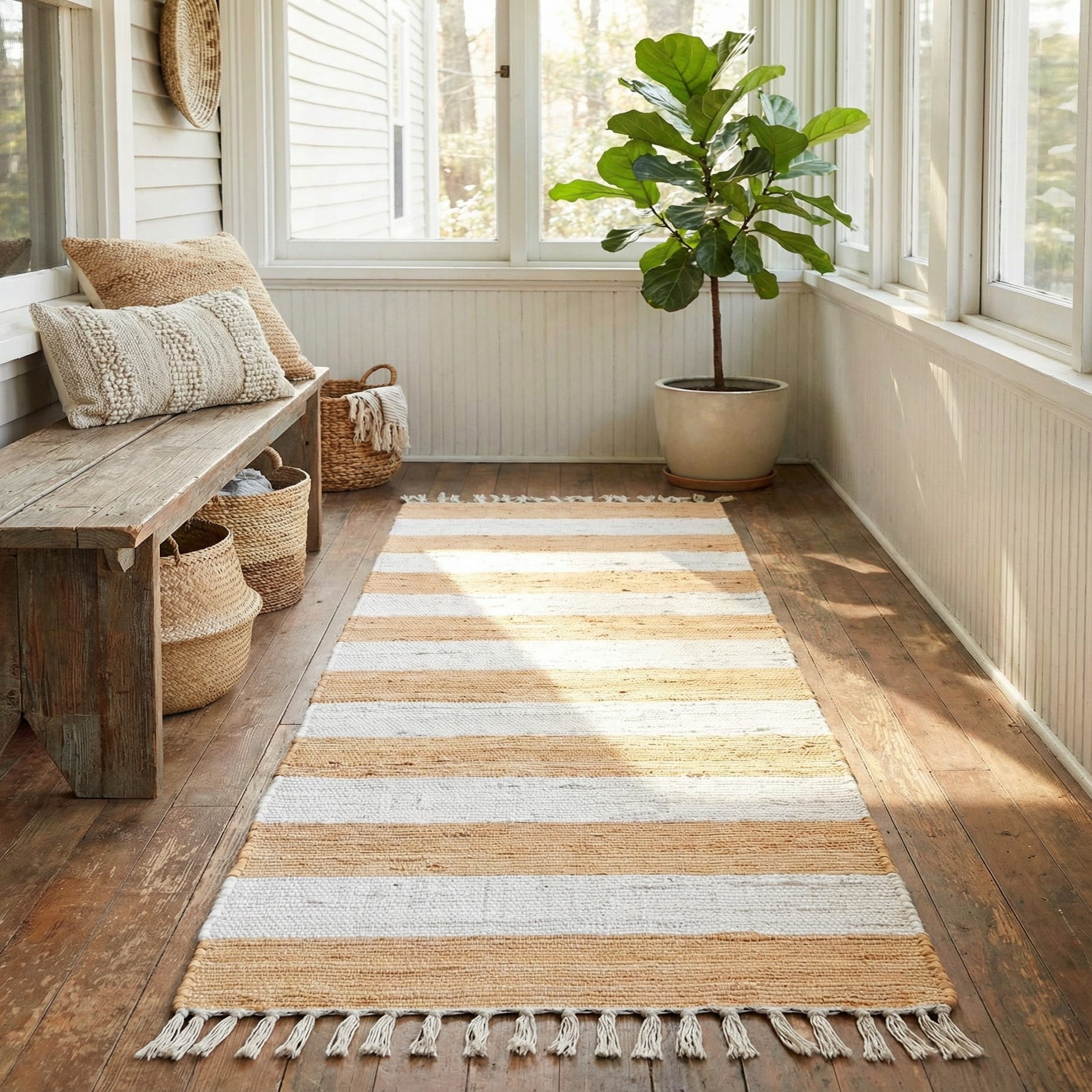 Place this runner where you want understated texture and a warm neutral palette: it layers well down a hallway or entry, anchors a kitchen galley, or runs alongside a bed to add a soft step in the morning. It complements coastal, Scandinavian, modern farmhouse, and relaxed contemporary interiors, pairing nicely with light woods, rattan or wicker accents, and linen upholstery for a calm, collected look.