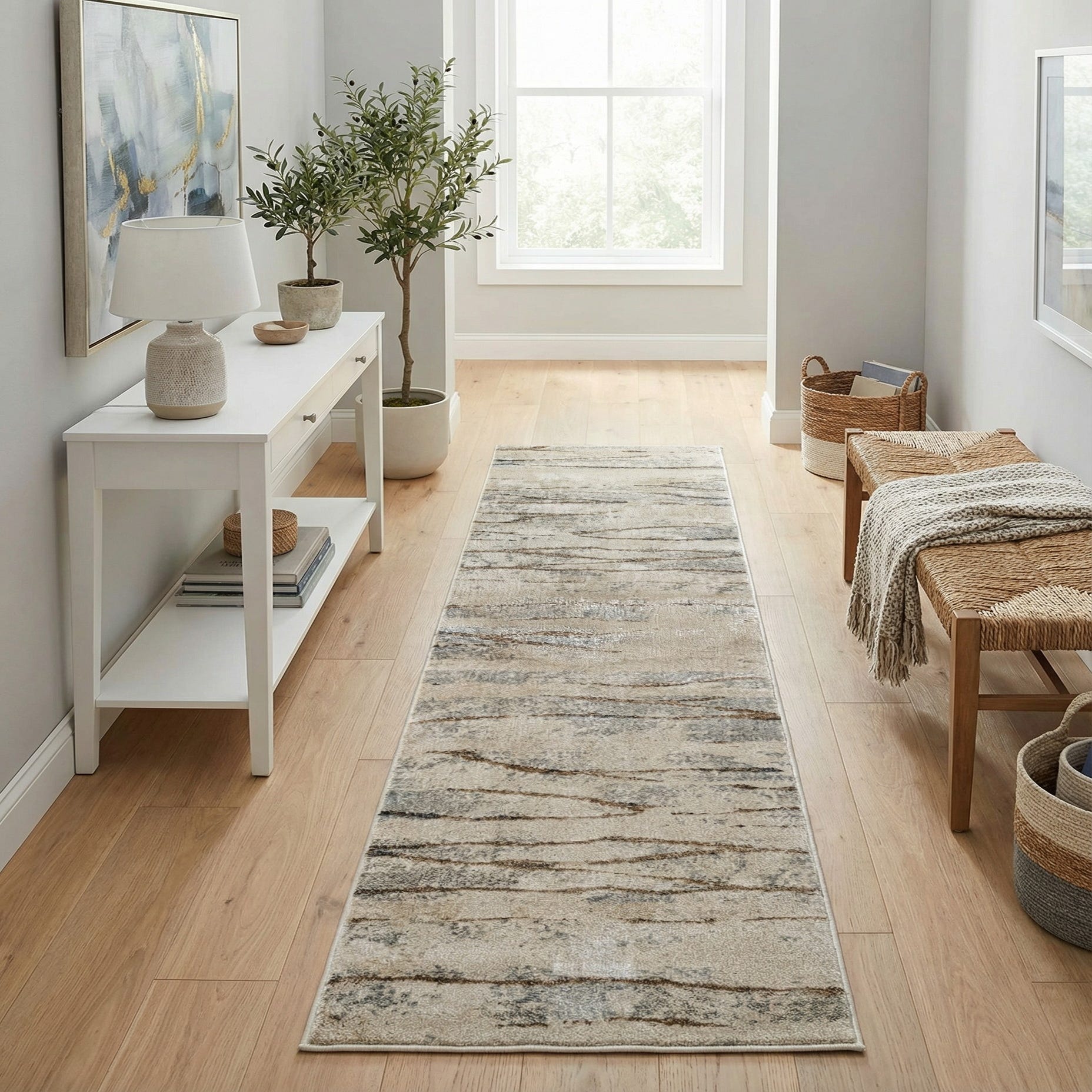 This runner works well in narrow or transitional spaces — place it in a hallway, entry, or alongside a bed to add warmth and visual interest. It pairs naturally with light or medium wood floors, neutral upholstery, and metal accents in brass or matte black. The palette and pattern complement contemporary, coastal, or modern farmhouse interiors and can also act as a muted anchor in a mid-century or transitional scheme.