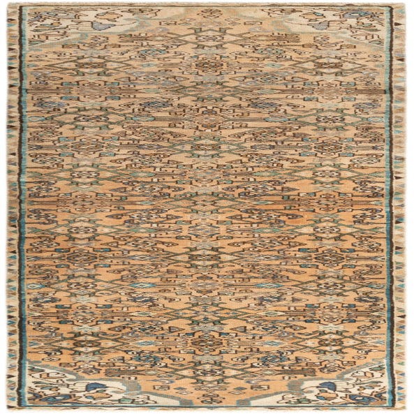 This hand-made Hamedan wool runner is a testament to the time-honored tradition of rug crafting. The 8-foot-long runner features a beige background punctuated with an intricate array of patterns in cream, dark blue, blue, and green, creating a harmonious blend of color that is versatile yet visually interesting. The texture of pure wool adds depth and tactile comfort underfoot.