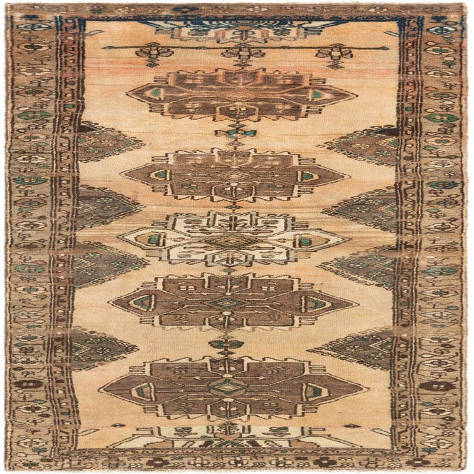 A handmade 8 ft Hamedan runner rug in browns, tans, and ivories, featuring traditional tribal patterns.