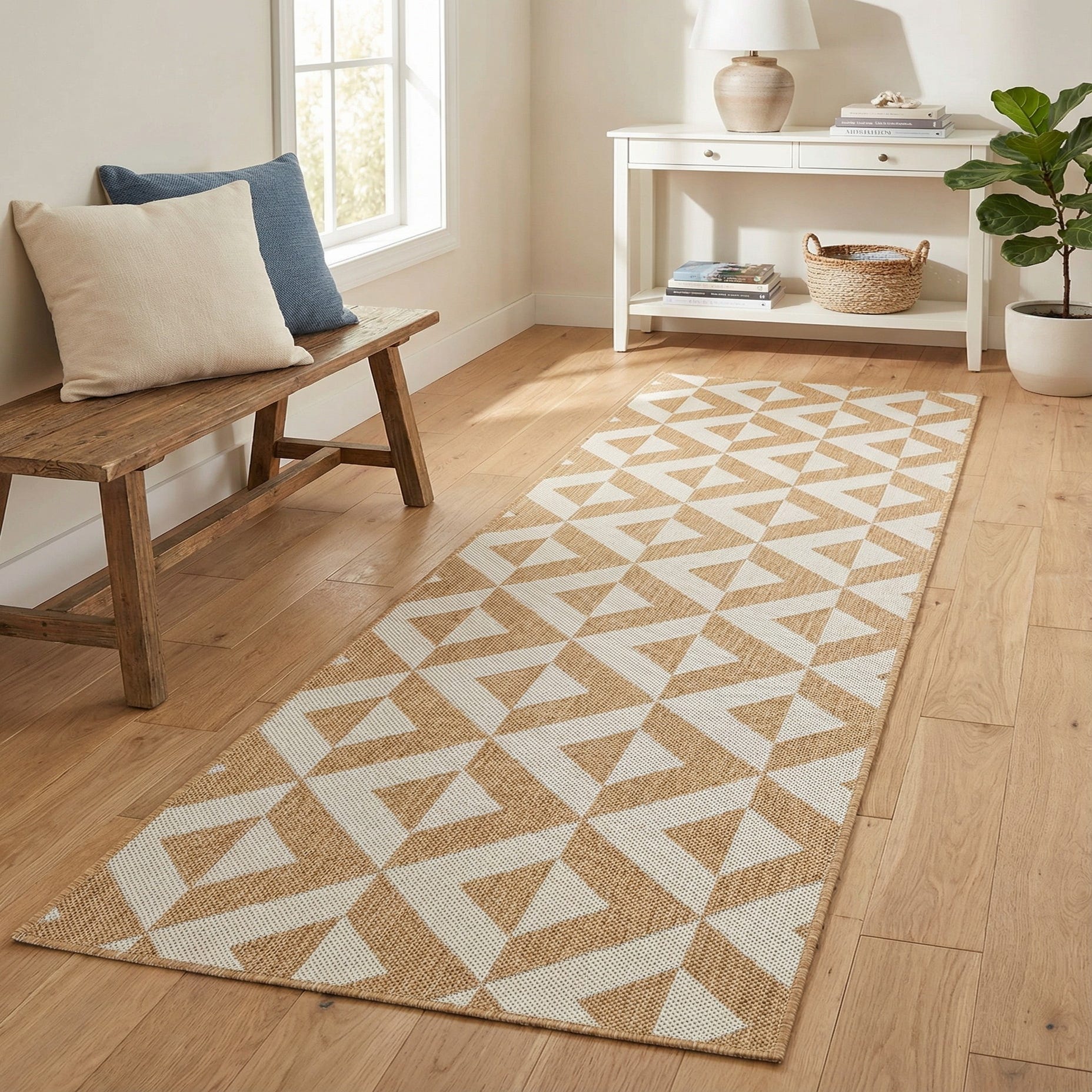 This runner works well in narrow circulation spaces like hallways or entryways, and is equally suited to a kitchen galley or sunroom where a defined path is desirable. It pairs naturally with light wood flooring, rattan or wicker furnishings, and neutral upholstery for a relaxed coastal or modern farmhouse look, and also complements cleaner, minimalist interiors where pattern provides subtle interest without overwhelming the space.