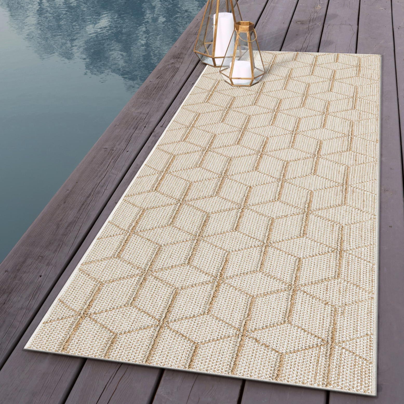 A beige and tan 8 ft runner rug with a modern geometric trellis pattern, suitable for a hallway or patio.