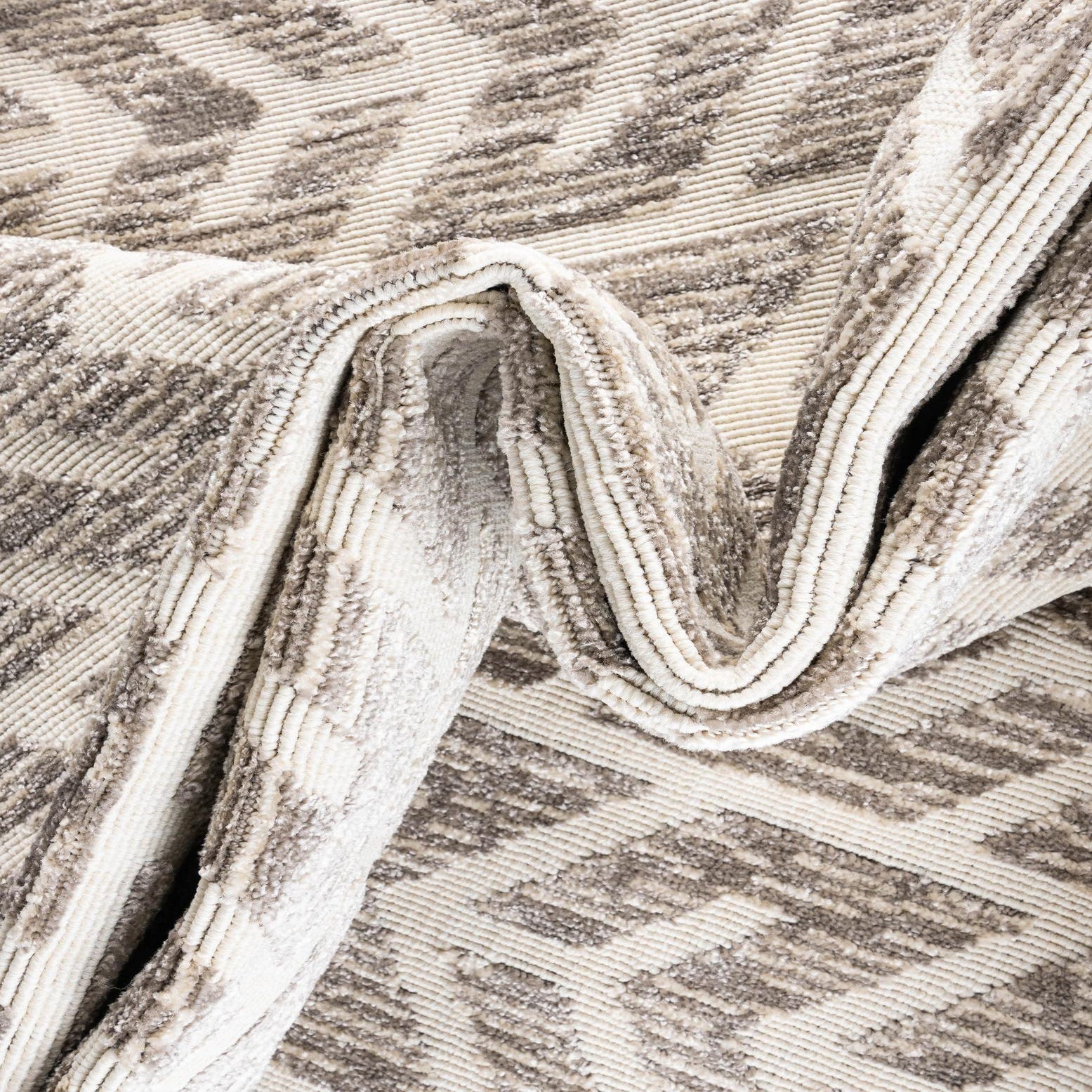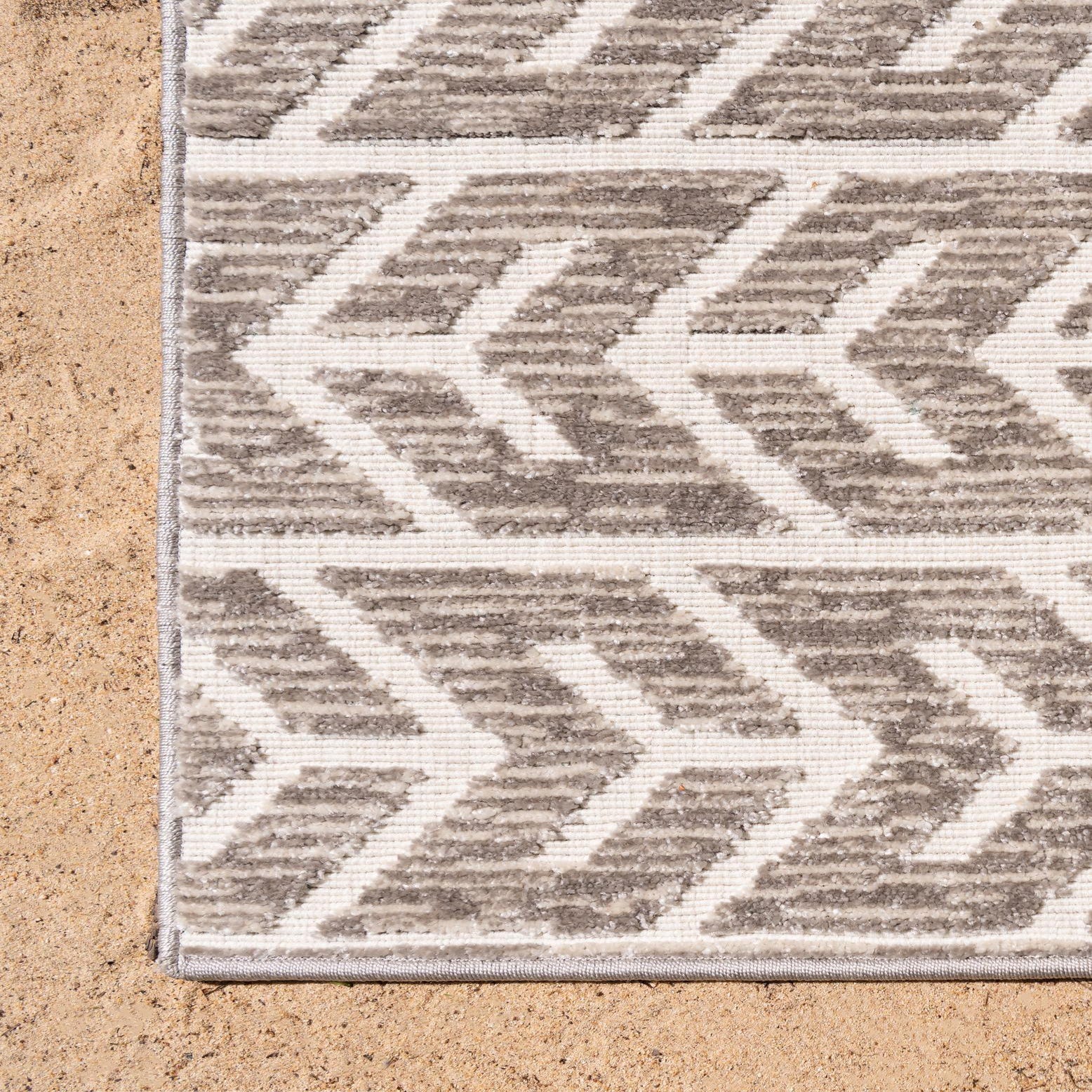 A warm beige ground provides a neutral backdrop for a repeating chevron-arrow motif rendered in ivory. The pattern is organized in horizontal bands that create gentle directional movement along the runner, while narrow ribbed strips between the rows add subtle linear texture. Machine-made of 100% polypropylene, the construction uses a cut-and-loop effect that gives the arrows a raised, plush feel against a slightly firmer, textured background—tactile contrast you can feel underfoot.