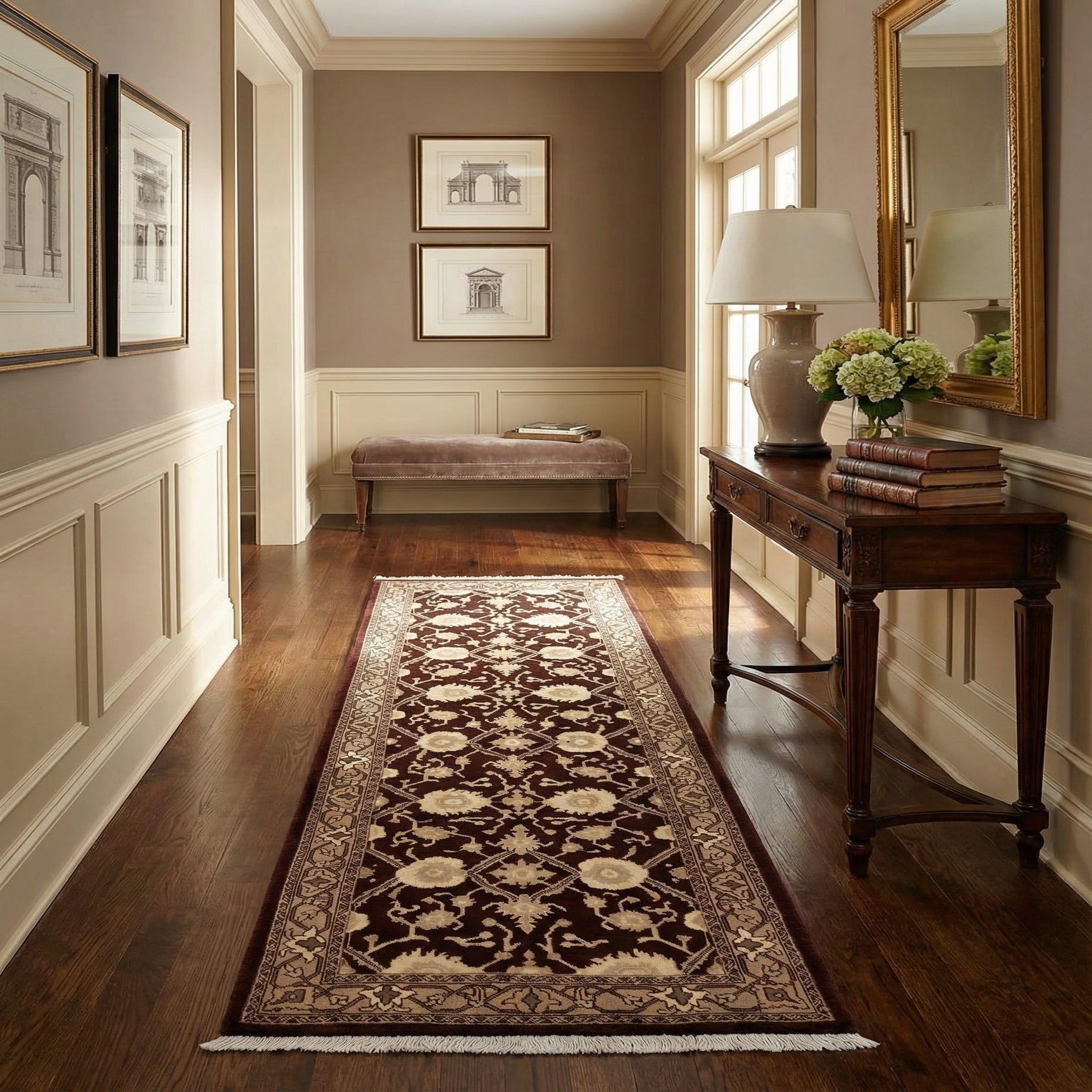 A handmade 8 ft runner rug featuring a rich brown background with intricate ivory and tan Persian floral patterns, ideal for a hallway.