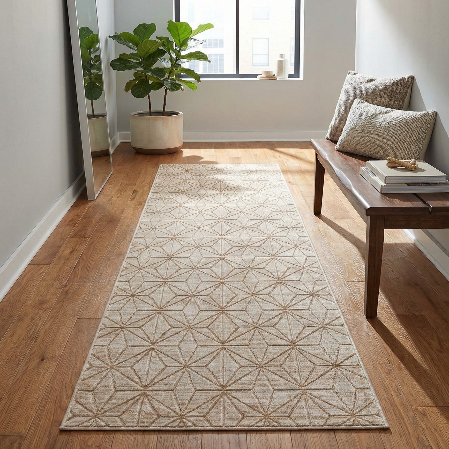 A low-profile, machine-made runner crafted of 70% polypropylene and 30% polyester, this rug pairs a beige ground with a warm tan geometric motif for a calm, contemporary look. The pattern is a repeated series of angular diamonds and starburst-like forms that create steady visual rhythm across the length of the runner. The pile is soft but restrained, with the design rendered in a slightly raised texture that adds gentle dimension you can feel beneath your feet.