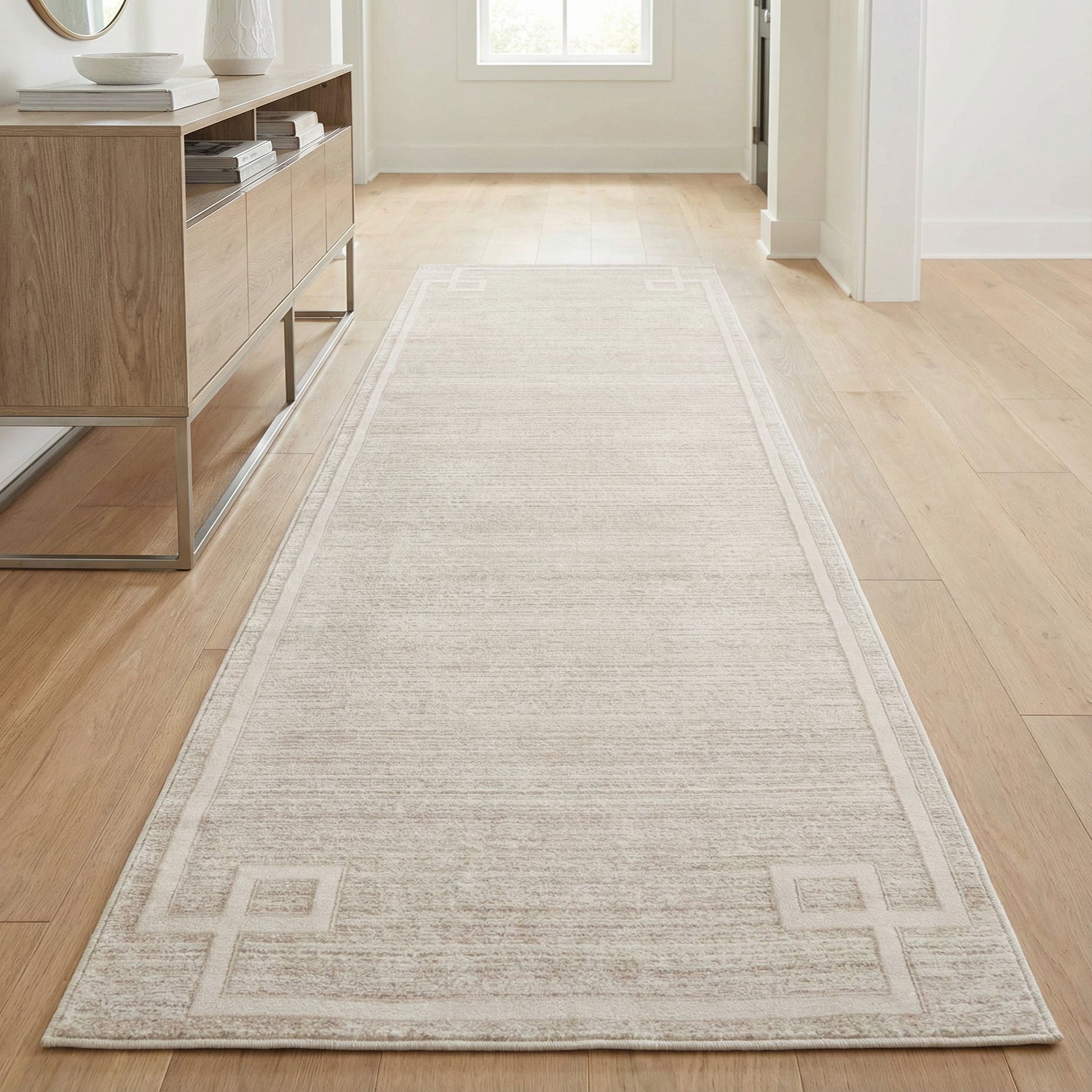 A soft beige field woven with fine striations of ivory and light brown creates a quietly textured surface, while a narrow double-line border and stepped square corner motifs add subtle architectural interest. The low-profile pile is machine made from 70% polypropylene and 30% polyester, giving the runner a smooth, slightly cushioned hand with a gentle contrast where the border and motifs are raised just a touch.