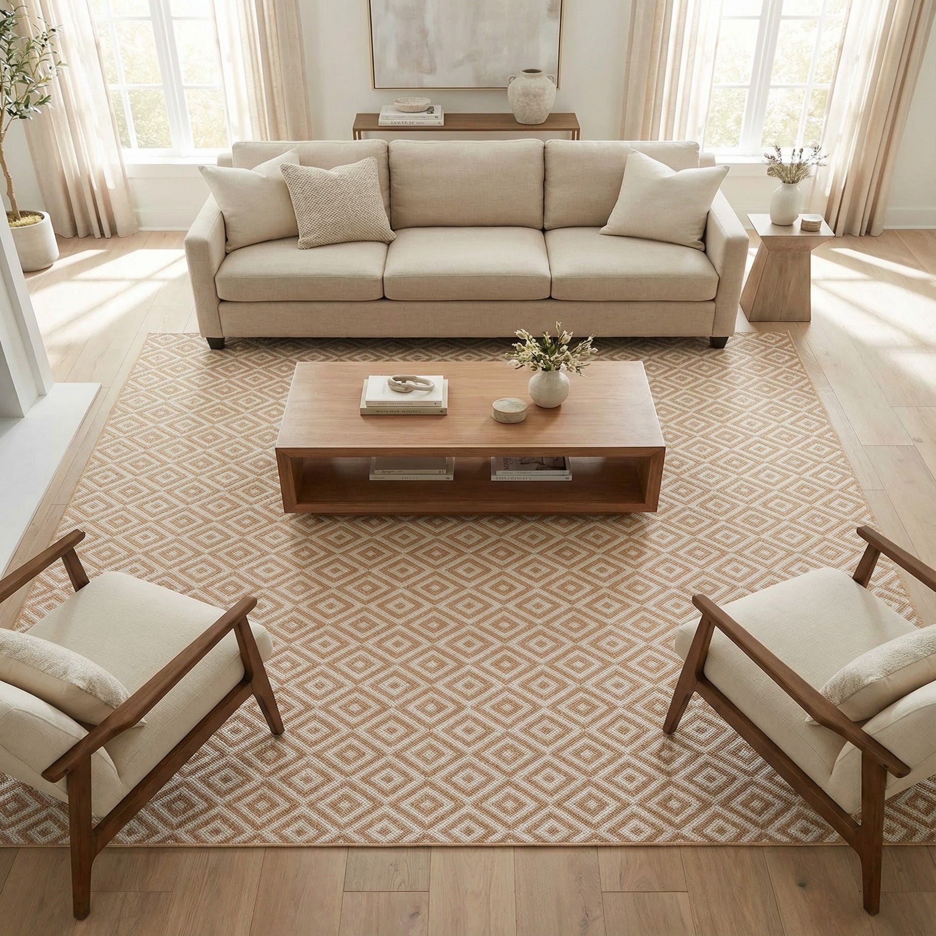 The neutral color scheme and structured design of this outdoor rug make it versatile for various design contexts. It would work well in modern, minimalist, and even bohemian decor settings due to its clean lines and unobtrusive color palette. This rug could serve as a subtle backdrop for more vibrant furniture pieces or harmonize with a monochromatic setting to enhance an atmosphere of calm and sophistication.