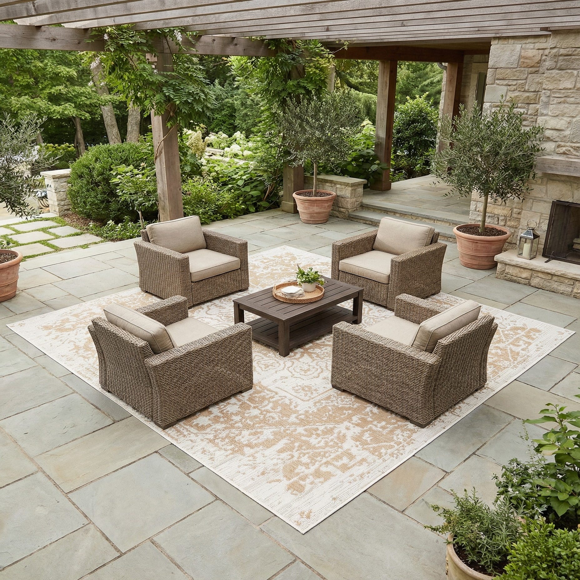 Given its design and construction, this area rug is ideally suited for outdoor areas such as patios, decks, or poolside spaces, as well as high-traffic indoor spaces that require easy maintenance. The neutral beige and brown hues allow it to blend seamlessly with wood, wicker, and other natural materials, and it complements a broad range of decor styles, from traditional to modern.