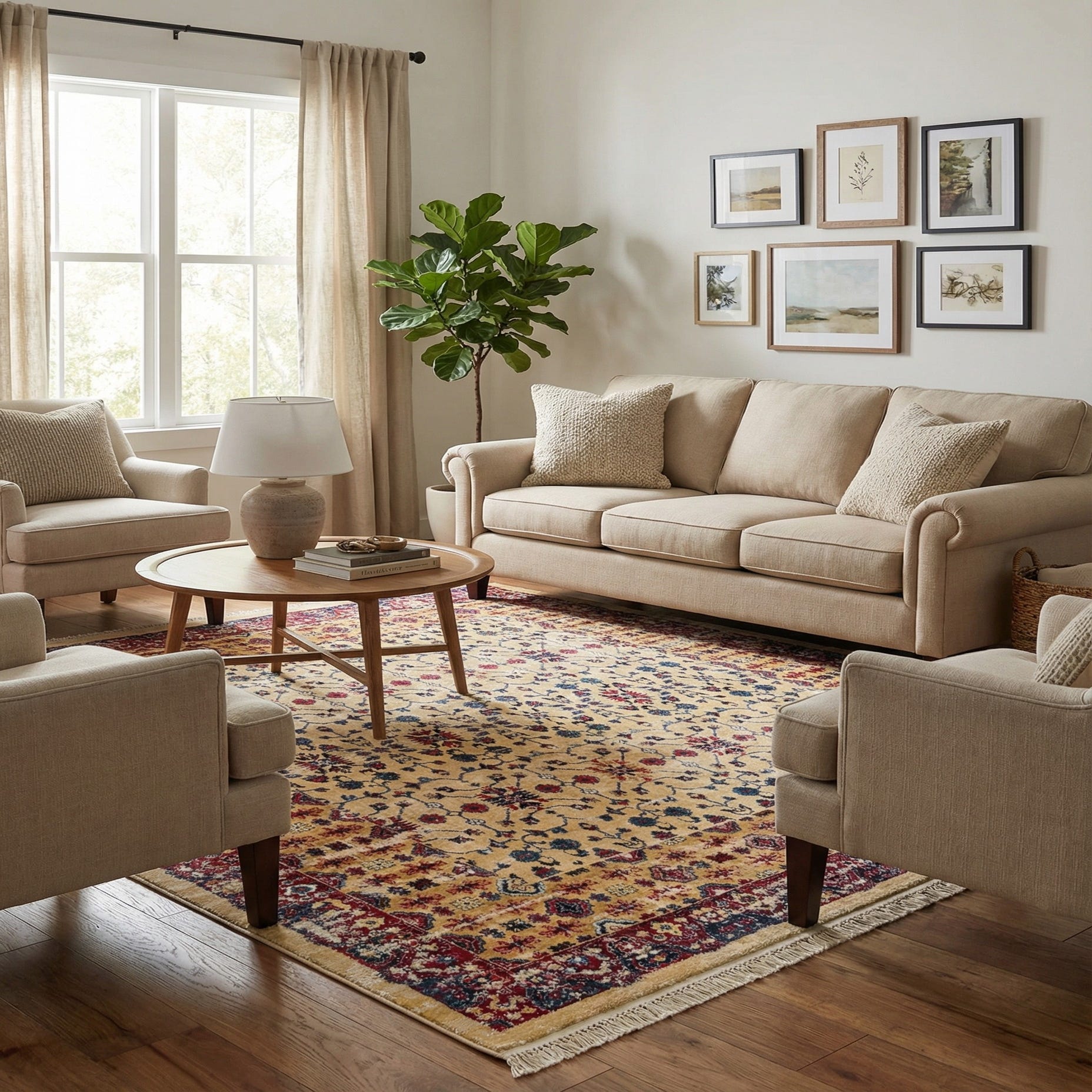 Machine-made from 100% polypropylene, the rug has a low, dense pile with a softly brushed surface that feels smooth underfoot and sits neatly under furniture legs. Use it to define a living room seating arrangement, ground a dining table, or add traditional warmth to an entry or home office. It pairs especially well with warm wood tones, navy or ivory upholstery, and brass or matte-black accents for a balanced, layered interior.