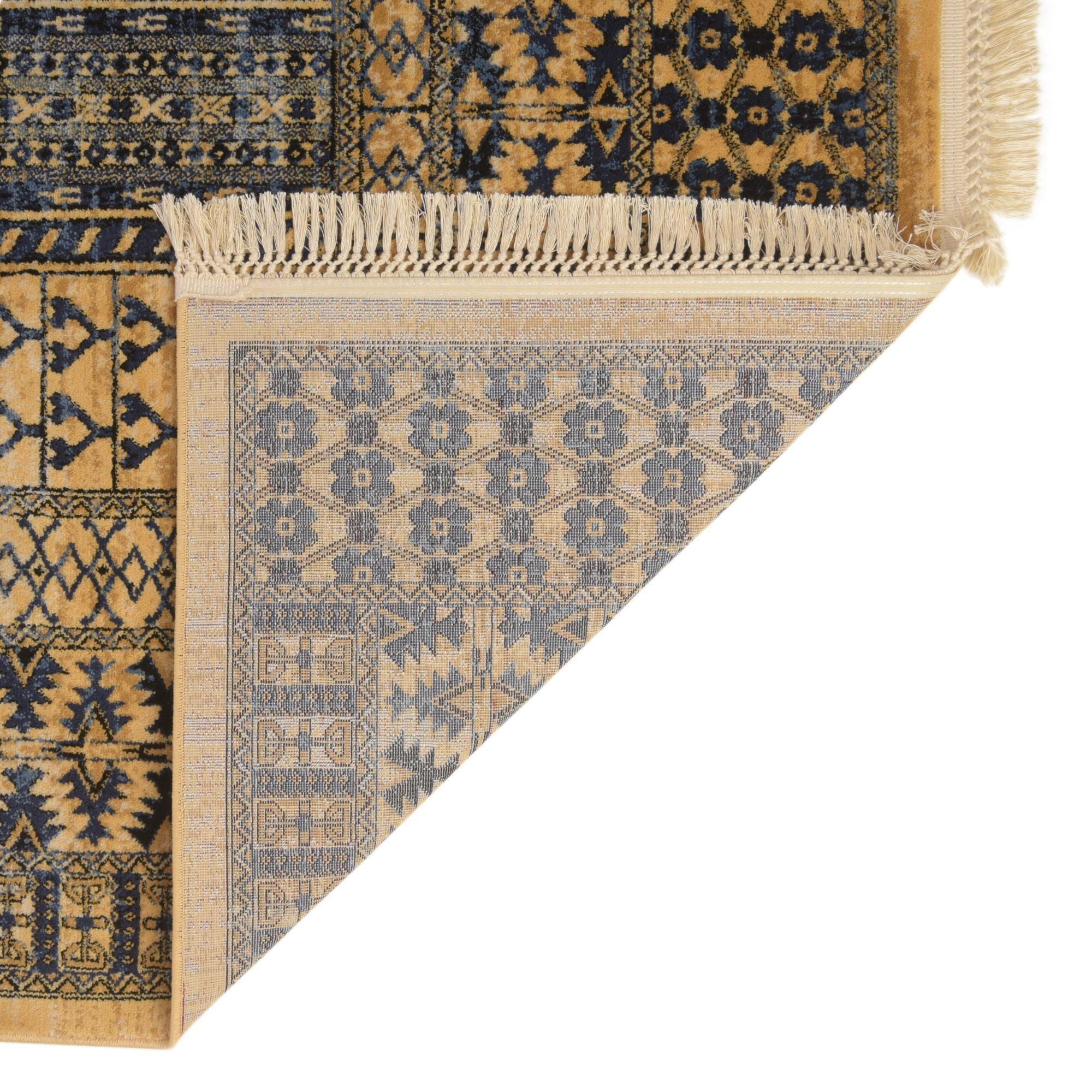 Primary color is Beige. Colors in this rug include: Beige, Black, Blue, Navy Blue.