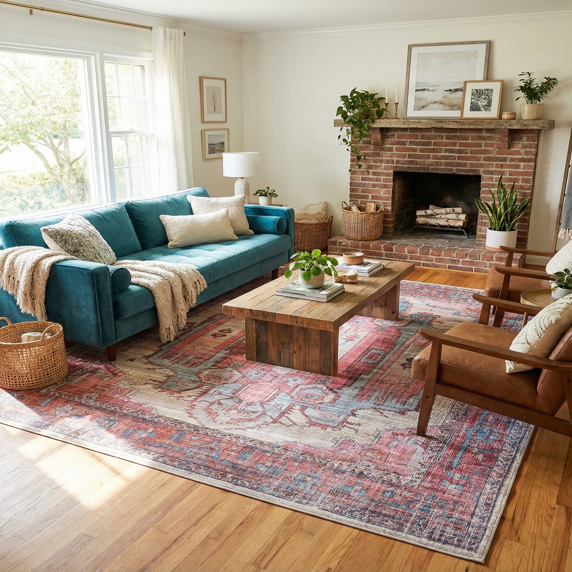 Machine-made from polyester chenille, the surface has a plush, velvety hand and a low, dense pile that compresses gently underfoot. The weave captures subtle color variations and a faint sheen that brings out the layered reds and blues without overwhelming the neutral base. This rug anchors a casual living room or a transitional seating area, pairs well with warm wood furniture and navy or light-blue accents, and works equally well beneath a coffee table, in a bedroom seating nook, or layered in an eclectic, bohemian scheme.