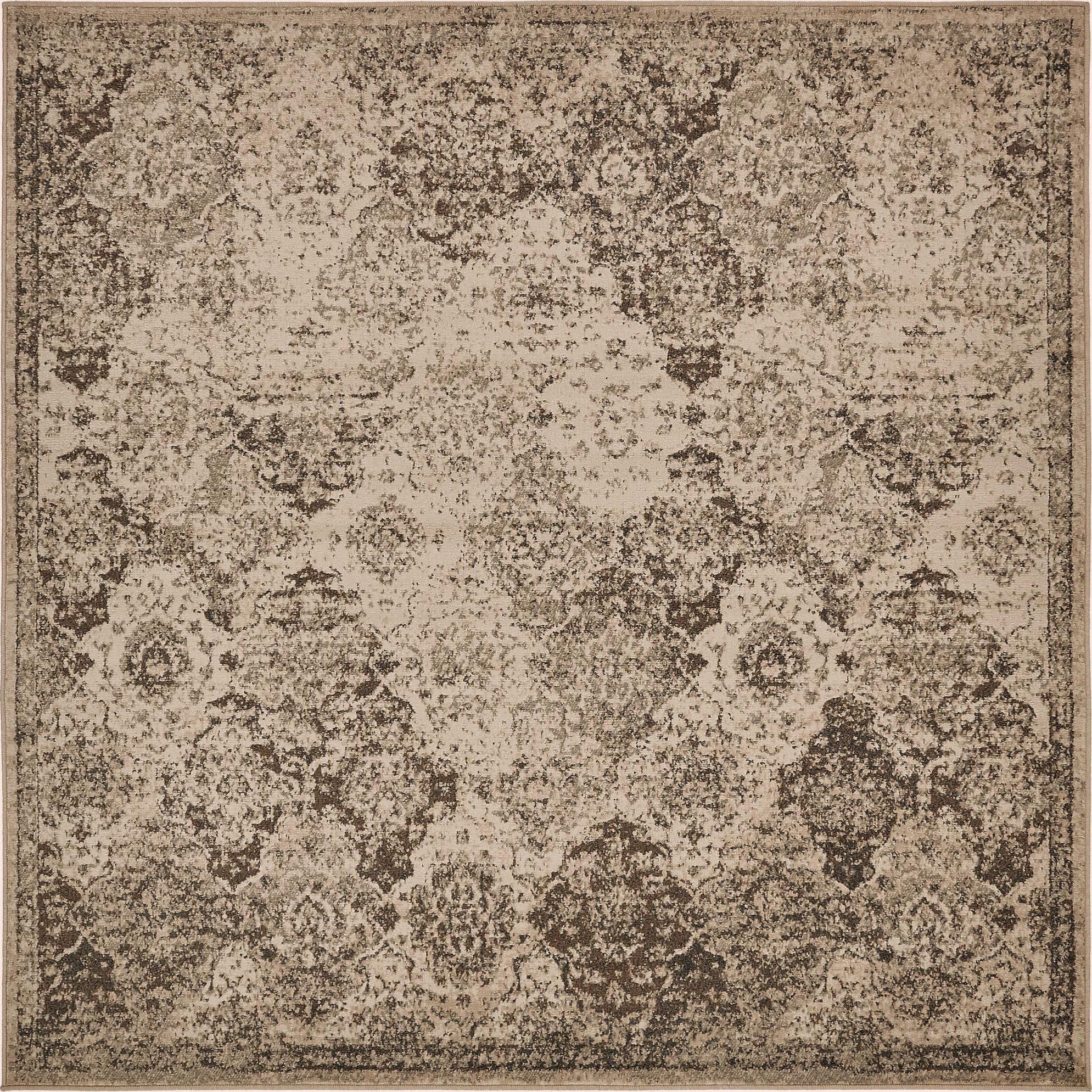Square 8' x 8' Mojave rug featuring a distressed traditional trellis pattern in shades of brown, tan, and ivory.