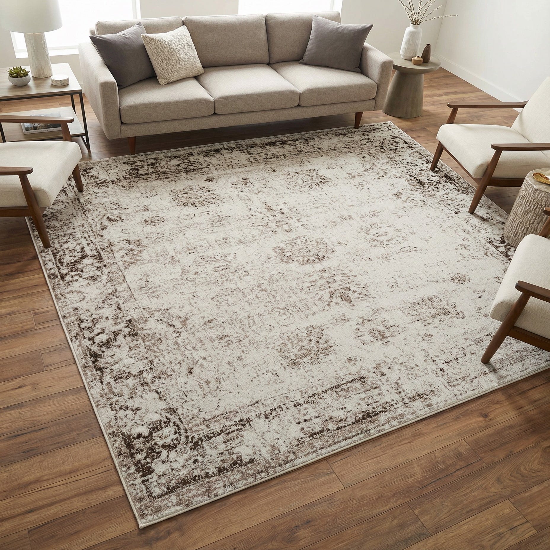 A softly distressed traditional pattern rests on a warm beige background, with brown and tan motifs forming a faded medallion and an understated border. The design has a lived-in look with delicate floral and geometric elements that blend into the field for a subtle, layered effect. Machine-made from 100% polypropylene, the rug has a low-profile pile that feels smooth underfoot; slight variations in texture highlight the pattern without adding heavy relief, and a gentle sheen gives the surface a refined, casual finish.