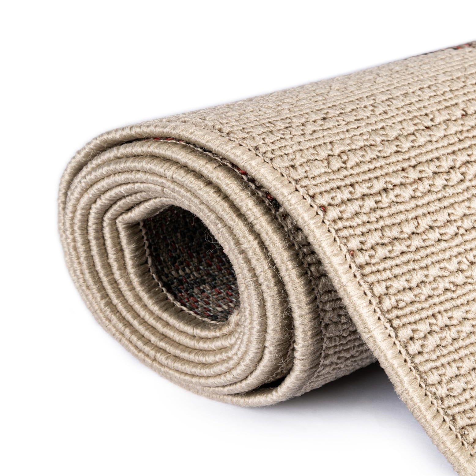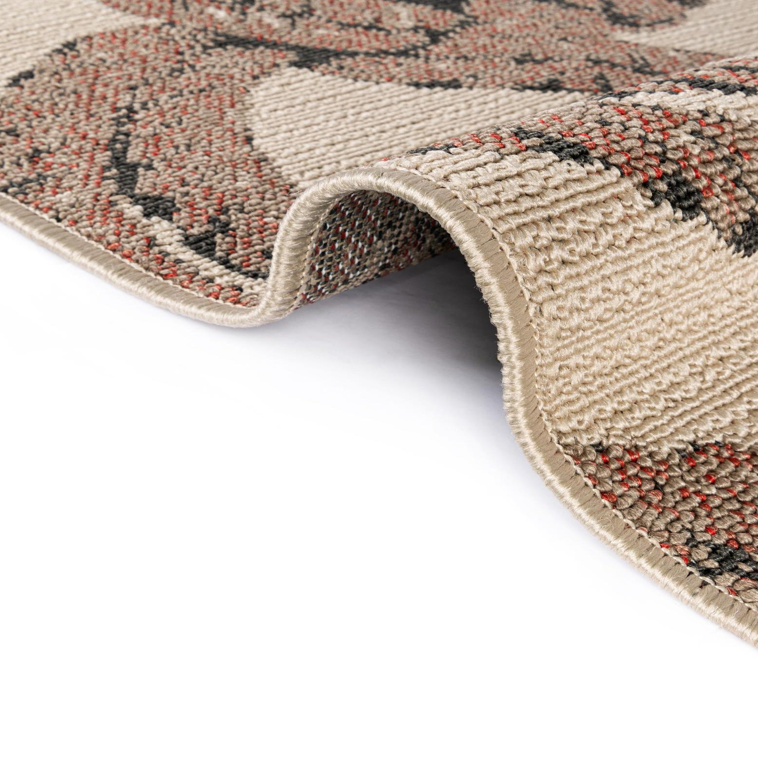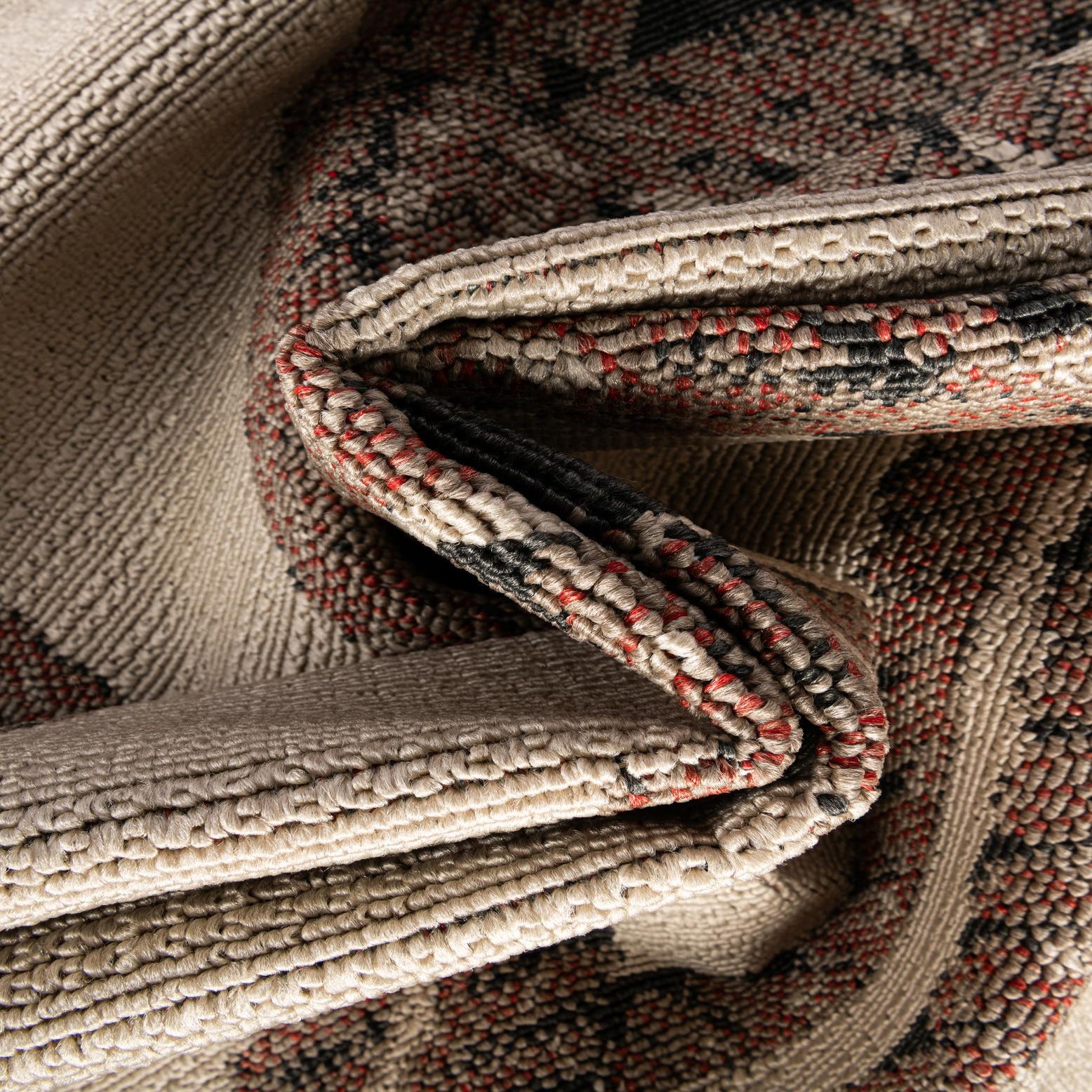 Primary color is Beige. Colors in this rug include: Beige, Black, Red, Light Brown.