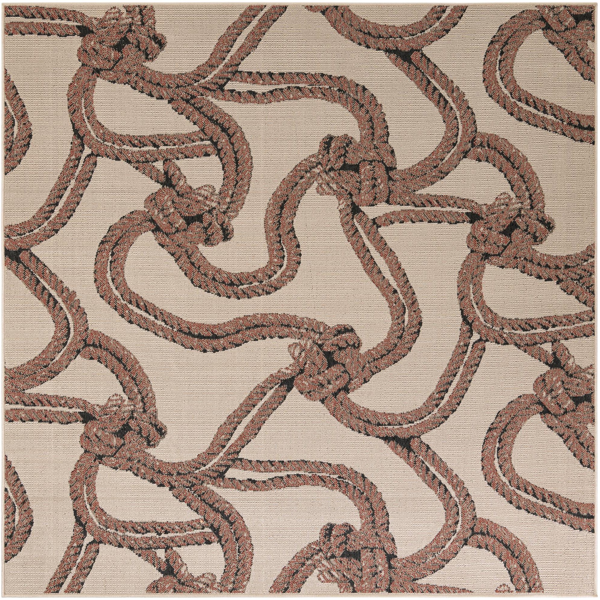 A square indoor/outdoor rug with a modern nautical pattern of intertwined brown and black ropes on a cream background.
