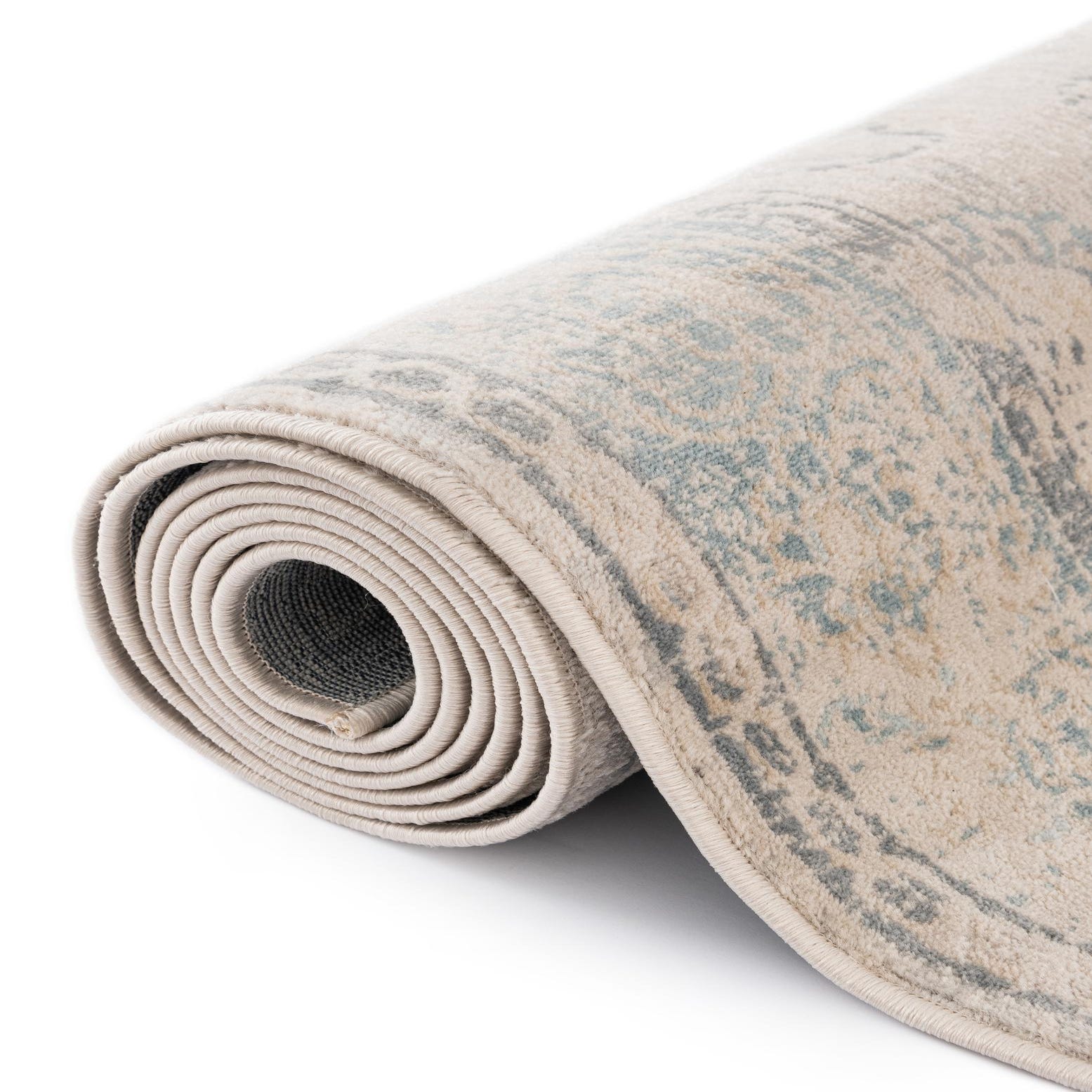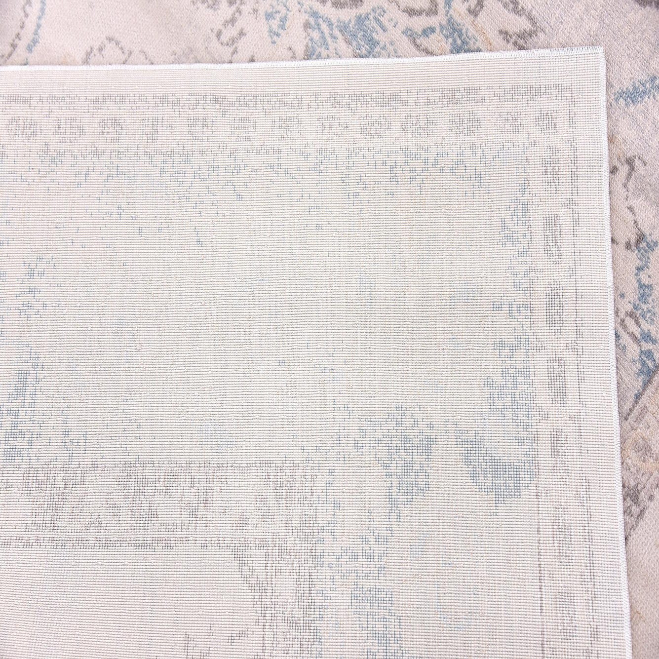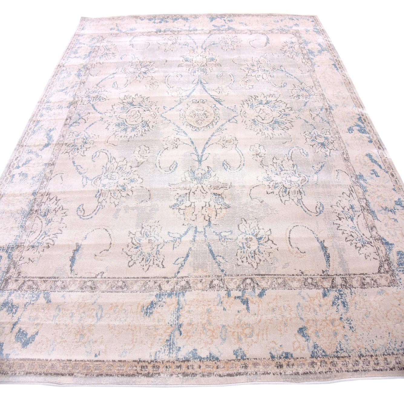 The color palette of this rug is subdued and sophisticated; a base of calming beige is accented by touches of blue, gray, and light brown hues that bring depth and complexity to the rug's appearance. The soft beige background serves as a neutral stage for the pattern, making this rug an adaptable addition to a variety of decor styles.