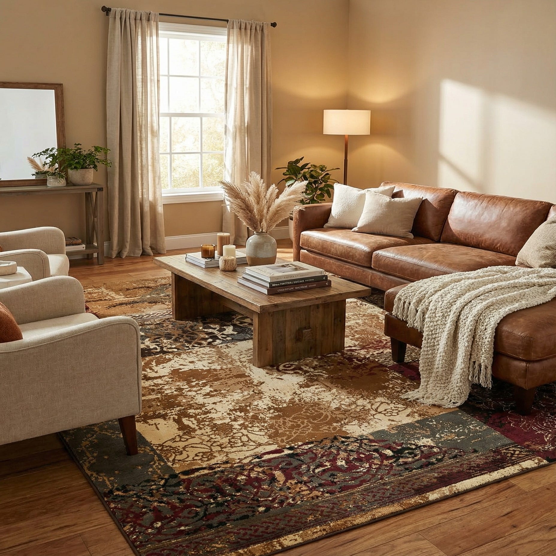 This rug works well as an anchor in a relaxed living room — pair it with a cream or tan sofa and dark wood furniture to play up the warm tones, or place it beneath a coffee table to bring visual interest to a neutral floor. It also complements eclectic or transitional schemes where layered textures and mixed finishes are welcome: think leather seating, industrial metal accents, or farmhouse-style wood. In entryways and dens the patterned surface hides everyday wear while adding color depth; in a dining area it ties together contrasting chair finishes and table tones for a cohesive look.