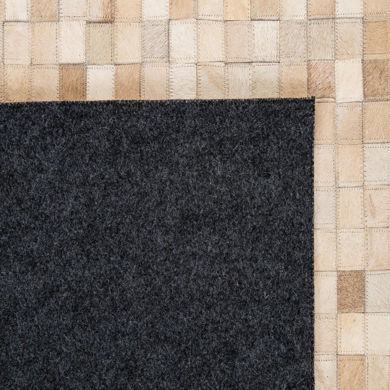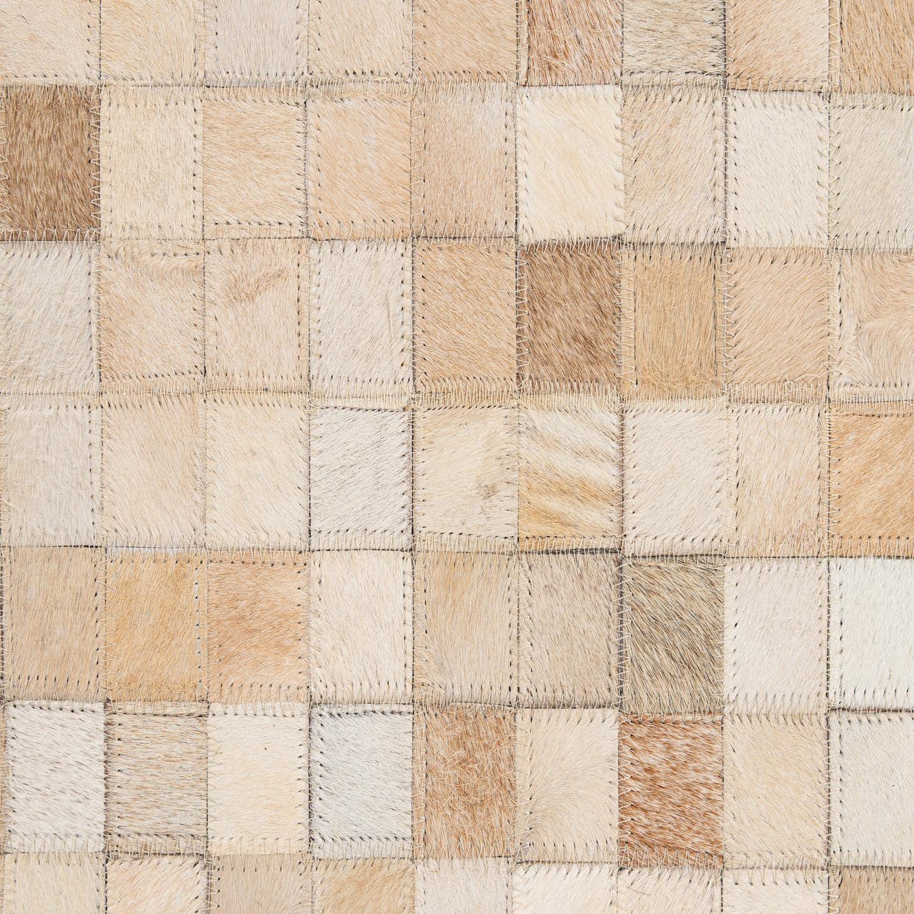 A tight patchwork of small, hand-stitched squares forms a calm, mosaic field in warm beige, ivory, and cream against a beige background. The pattern is subtle and orderly, with natural variation in each hide creating soft shifts in tone across the surface. Handmade of cowhide and leather, the rug has a pleasant hair-on-hide nap interrupted by smooth leather seams — a tactile mix of soft, touchable surface and a reassuring, structured feel underfoot.