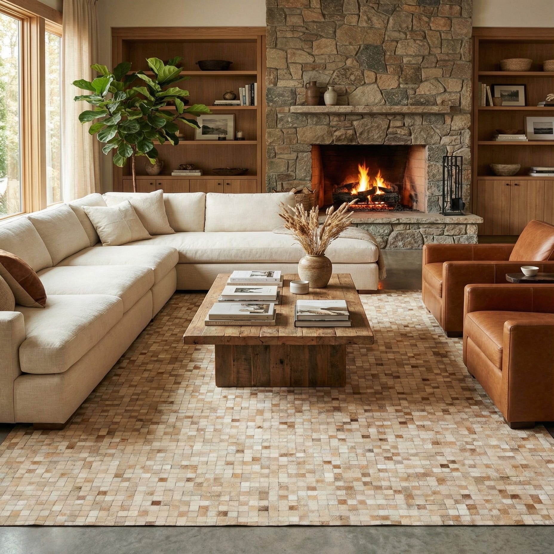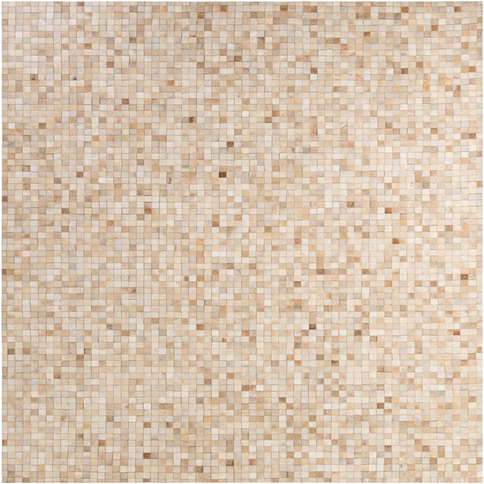8x10 rectangular Cowhide Patchwork rug featuring a mosaic of natural brown, tan, and cream squares.