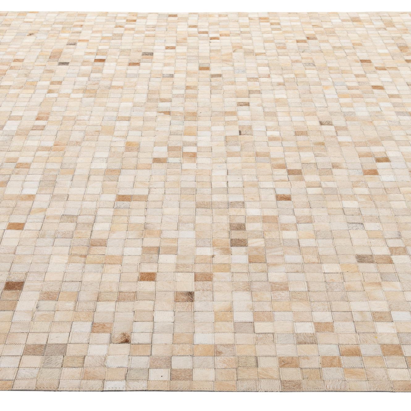 8x10 rectangular Cowhide Patchwork rug featuring a mosaic of small square pieces in varying shades of brown, tan, and ivory.