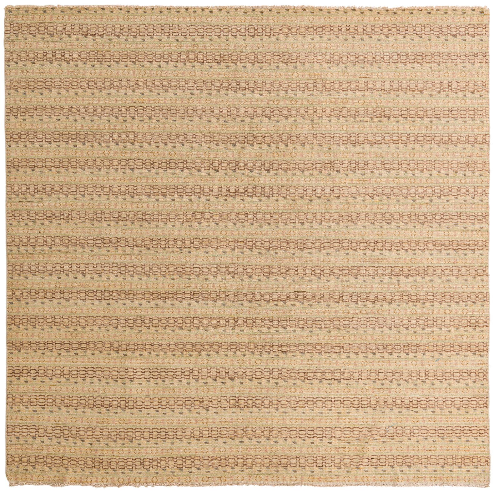 Warm beige provides the backdrop for a finely balanced banded design of small geometric motifs in brown, ivory and light green. Rows of linked lattice shapes alternate with tiny diamonds and dotted accents, creating a subtle linear rhythm across the surface. The hand-knotted construction in 100% wool produces a slightly nubby, dense texture that feels soft underfoot while retaining clear definition in the pattern; the finished ends add a casual, hand-crafted touch.