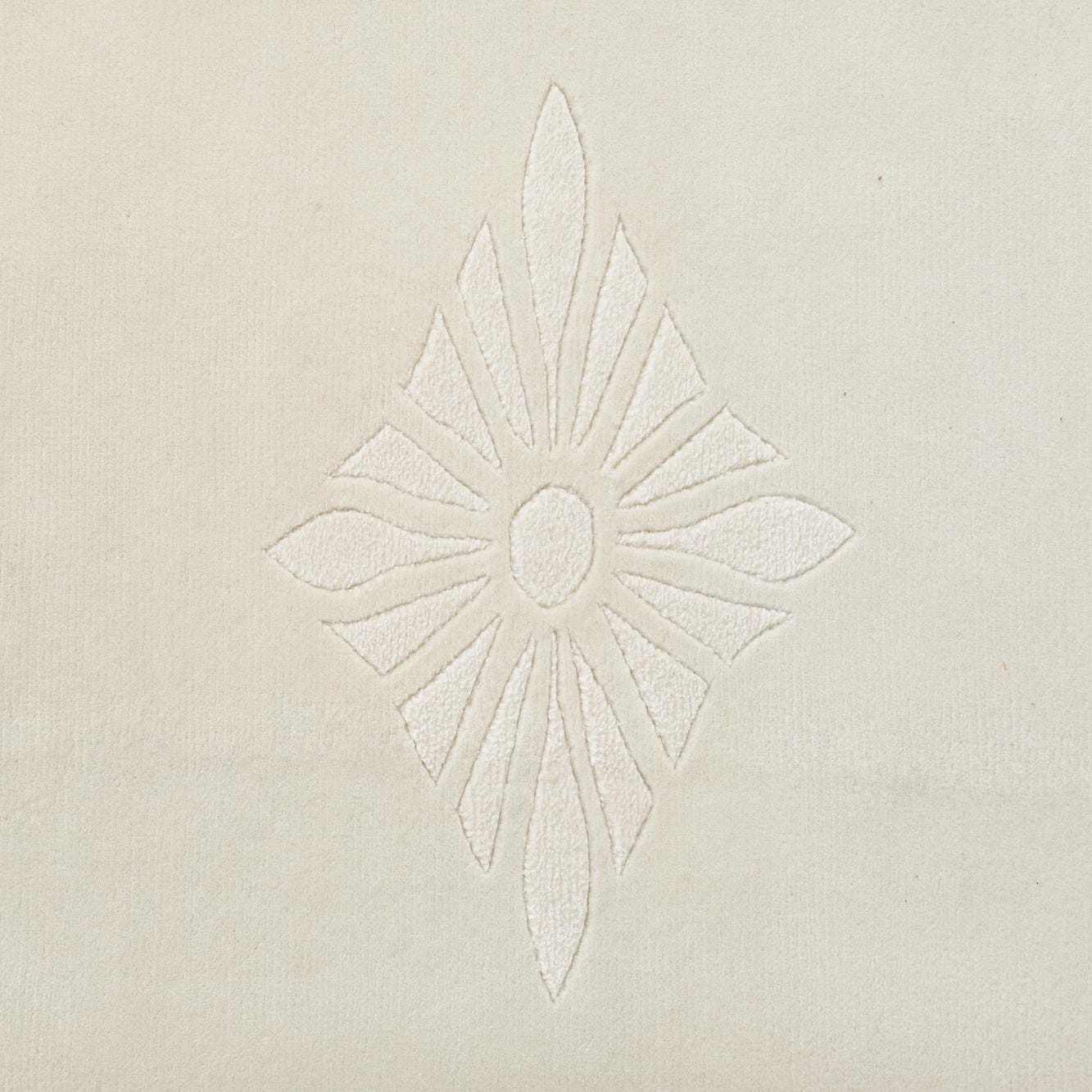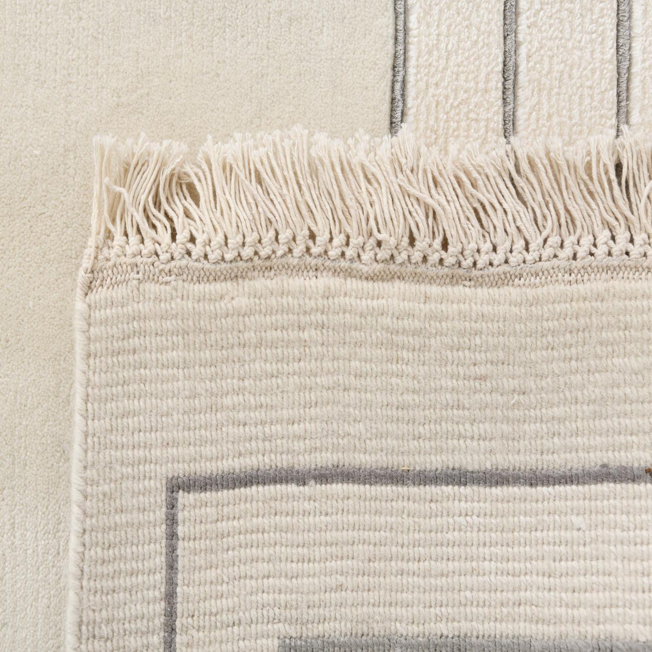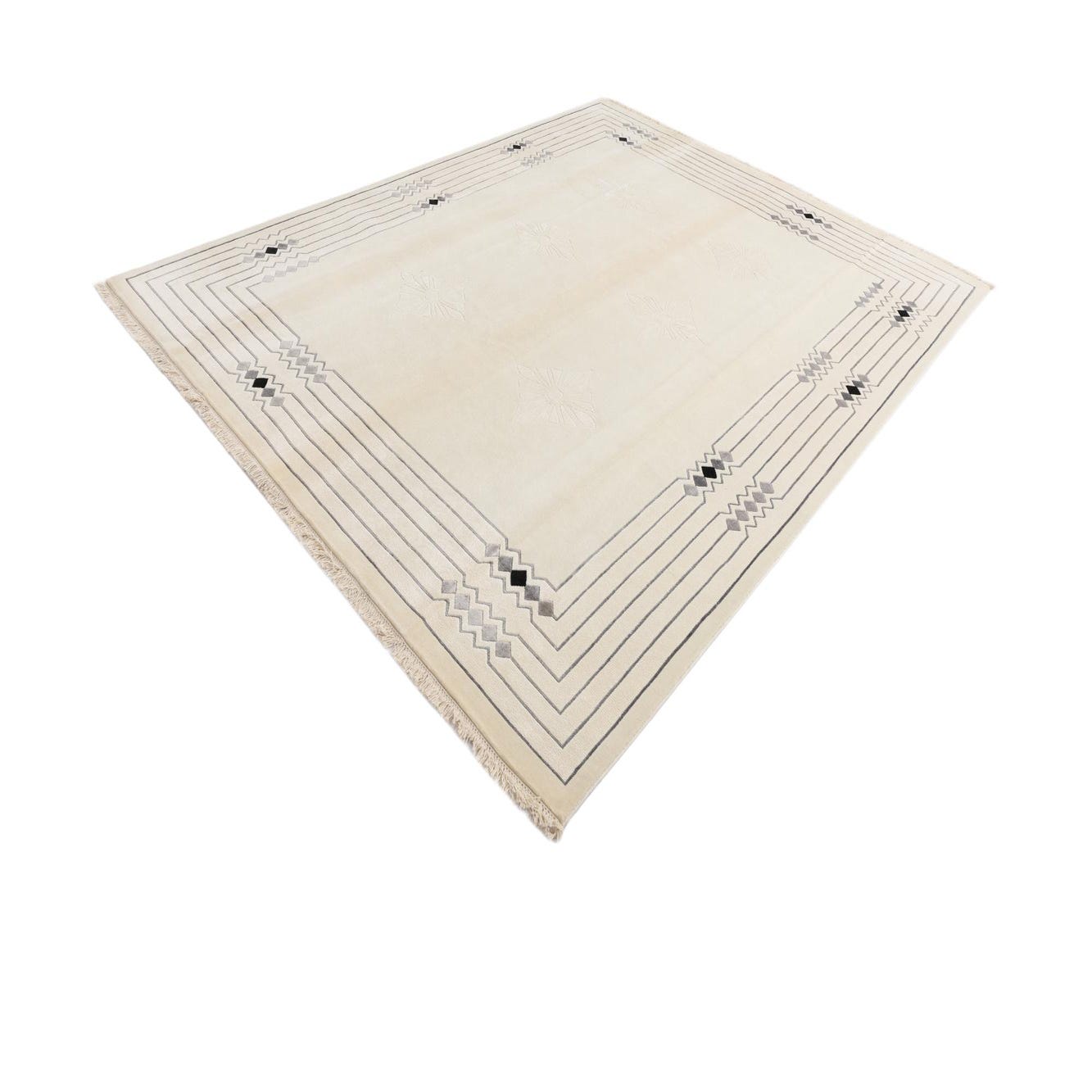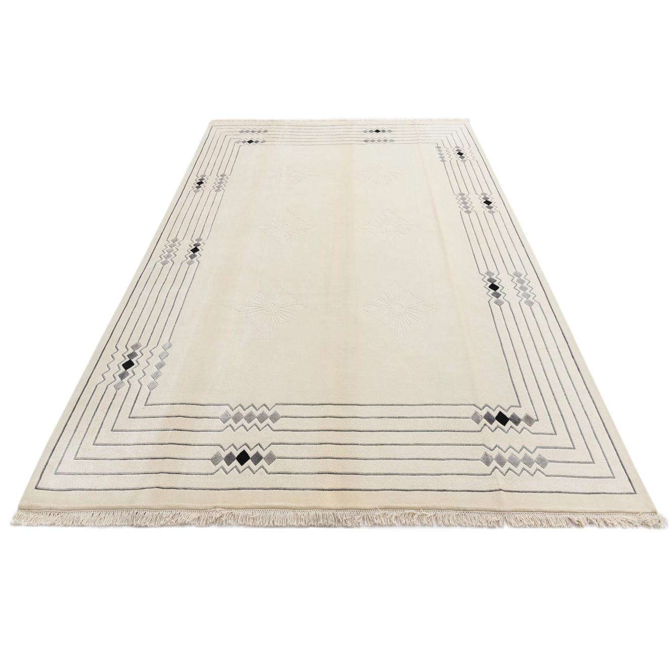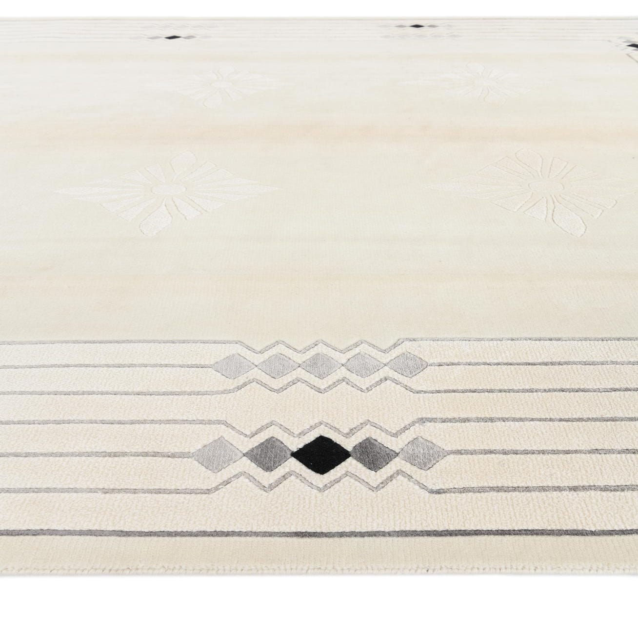 This hand-knotted 100% wool rug holds a calm, neutral presence with a warm beige field that highlights its restrained geometric pattern. Concentric linear bands form a clean border, interrupted by small diamond clusters in black, gray and tan that add measured contrast. Six tone-on-tone diamond-flower motifs sit in low relief across the central field, creating a subtle sculpted texture against the smooth ground. The wool pile feels dense and soft to the touch, with the raised motifs offering gentle dimensionality, and short fringed ends complete the look.