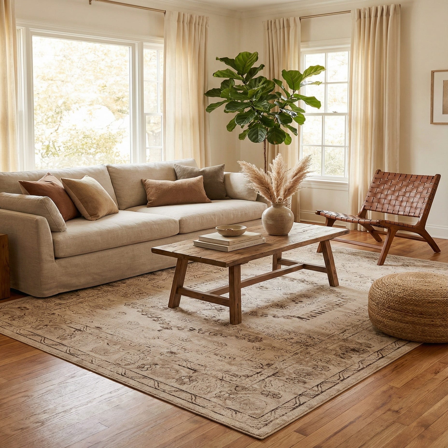 Works well in a range of interiors—place it beneath a seating group to ground a living room, layer it under a dining table to soften a dining area, or use it in a bedroom to add warmth at the foot of the bed. The neutral tones and traditional-yet-relaxed pattern pair easily with both classic furnishings and more contemporary pieces, making it a good fit for transitional, farmhouse, or warm-modern schemes that favor subtle pattern and understated color.