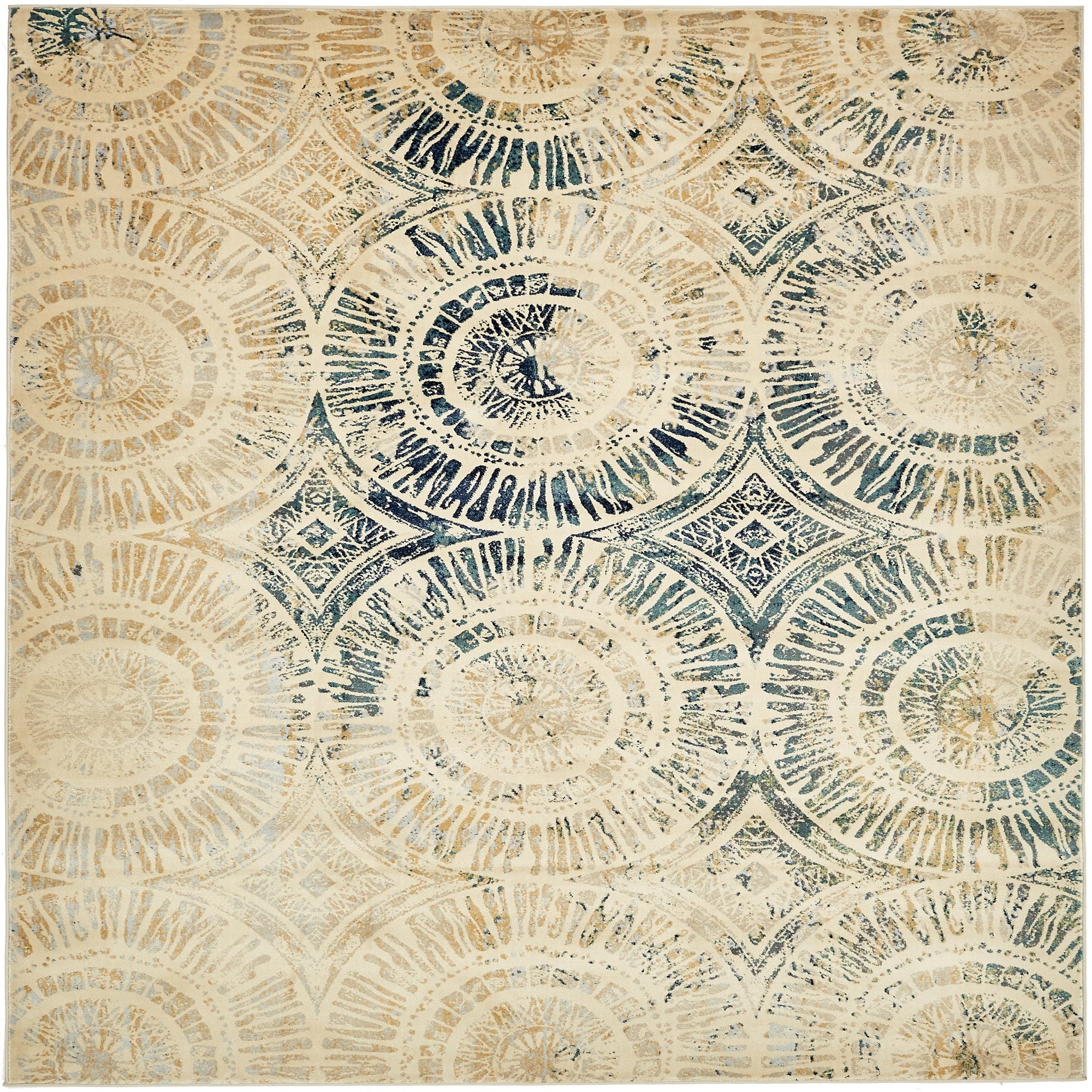 Primary color is Beige. Colors in this rug include: Beige, Light Blue, Navy Blue, Tan.