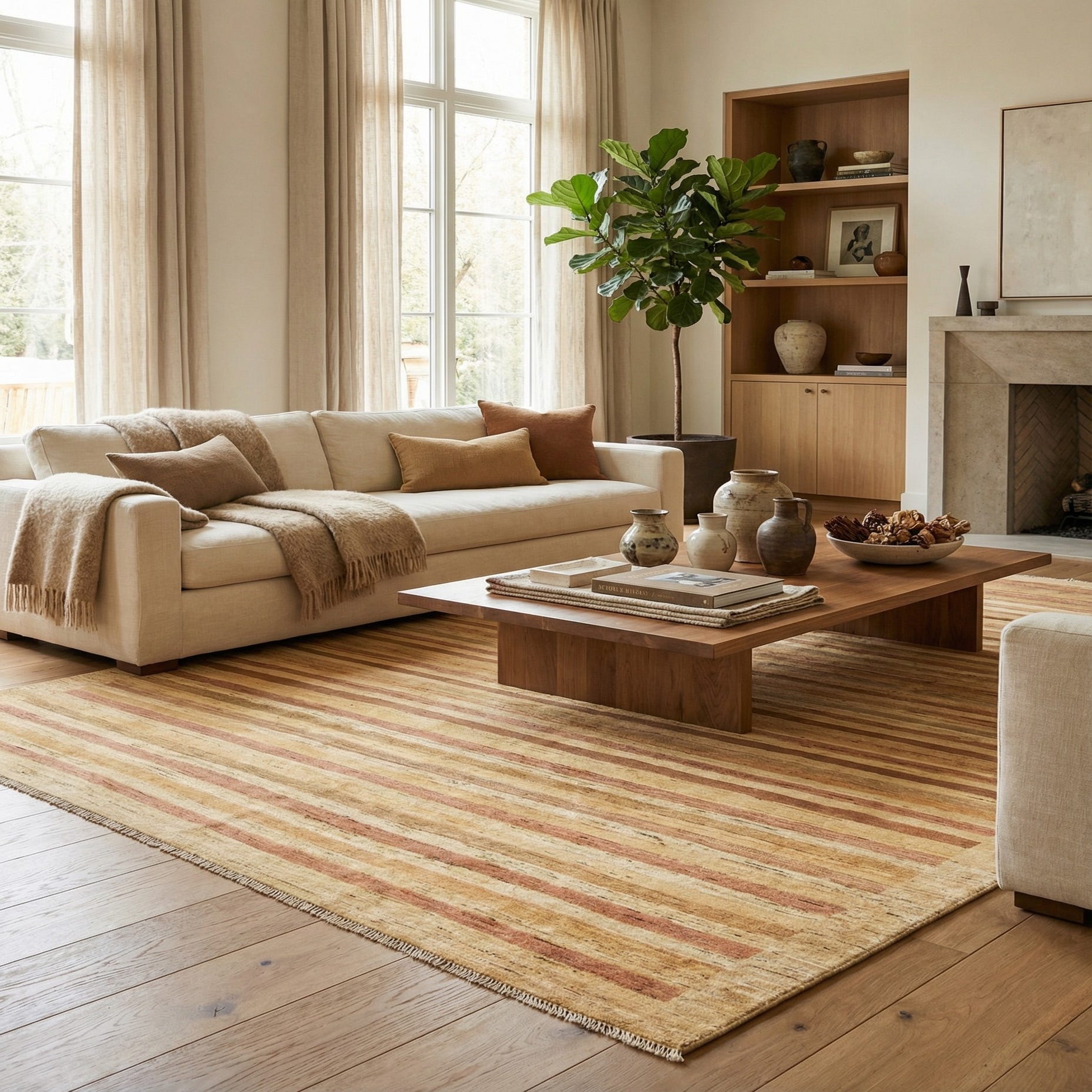 The rug showcases a linear, striped pattern, which adds a sense of movement and can visually expand the space it occupies. Its texture provides a tactile experience that enhances the overall aesthetic appeal. The balanced use of neutral colors allows it to integrate seamlessly into an array of décors, from minimalist and modern to more traditional settings.