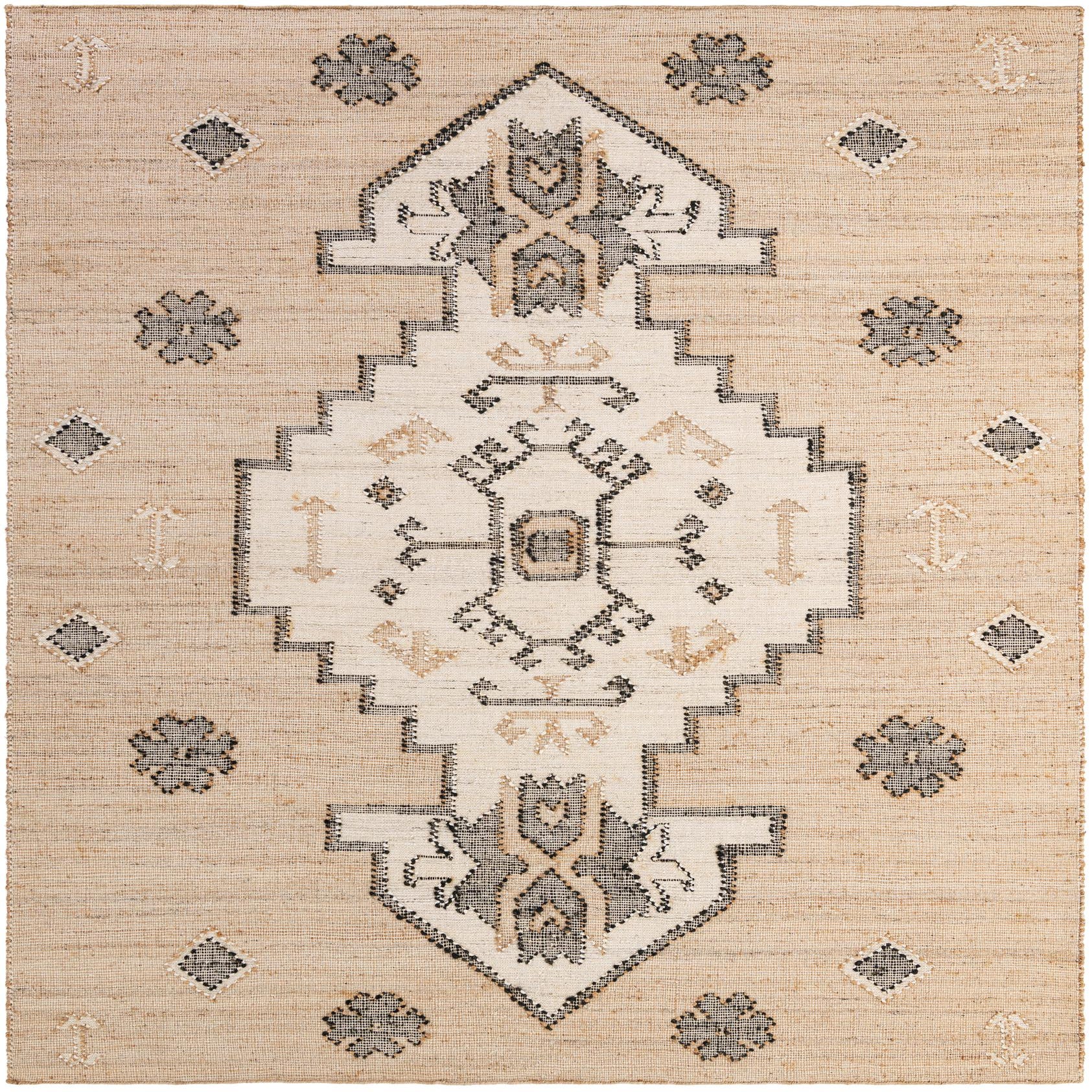 8x10 rectangular jute and cotton rug featuring a traditional medallion pattern in natural brown, cream, and black.
