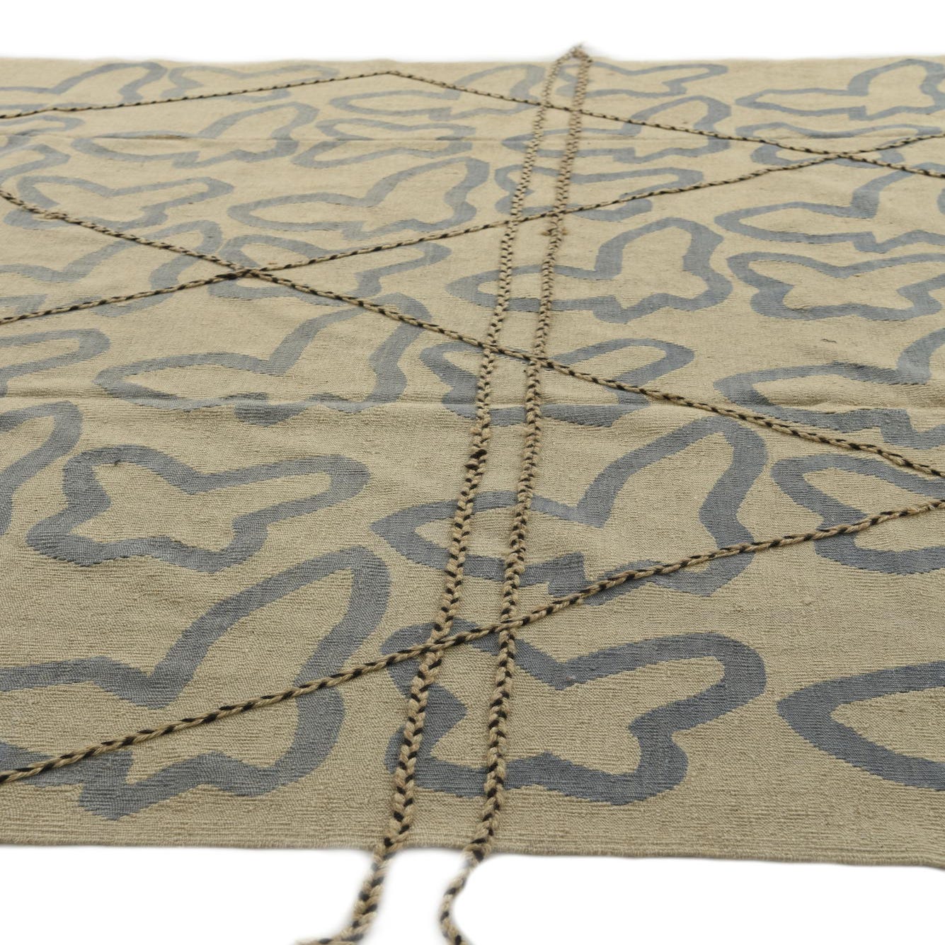 The Kilim Modern collection presents a hand-woven 8x10 rug crafted with 100% wool, reflecting a commitment to durability and comfort. This design showcases a beige background accented by a dynamic pattern of geometric shapes in shades of black and gray. The contrasting colors create a visual narrative that's both engaging and sophisticated.