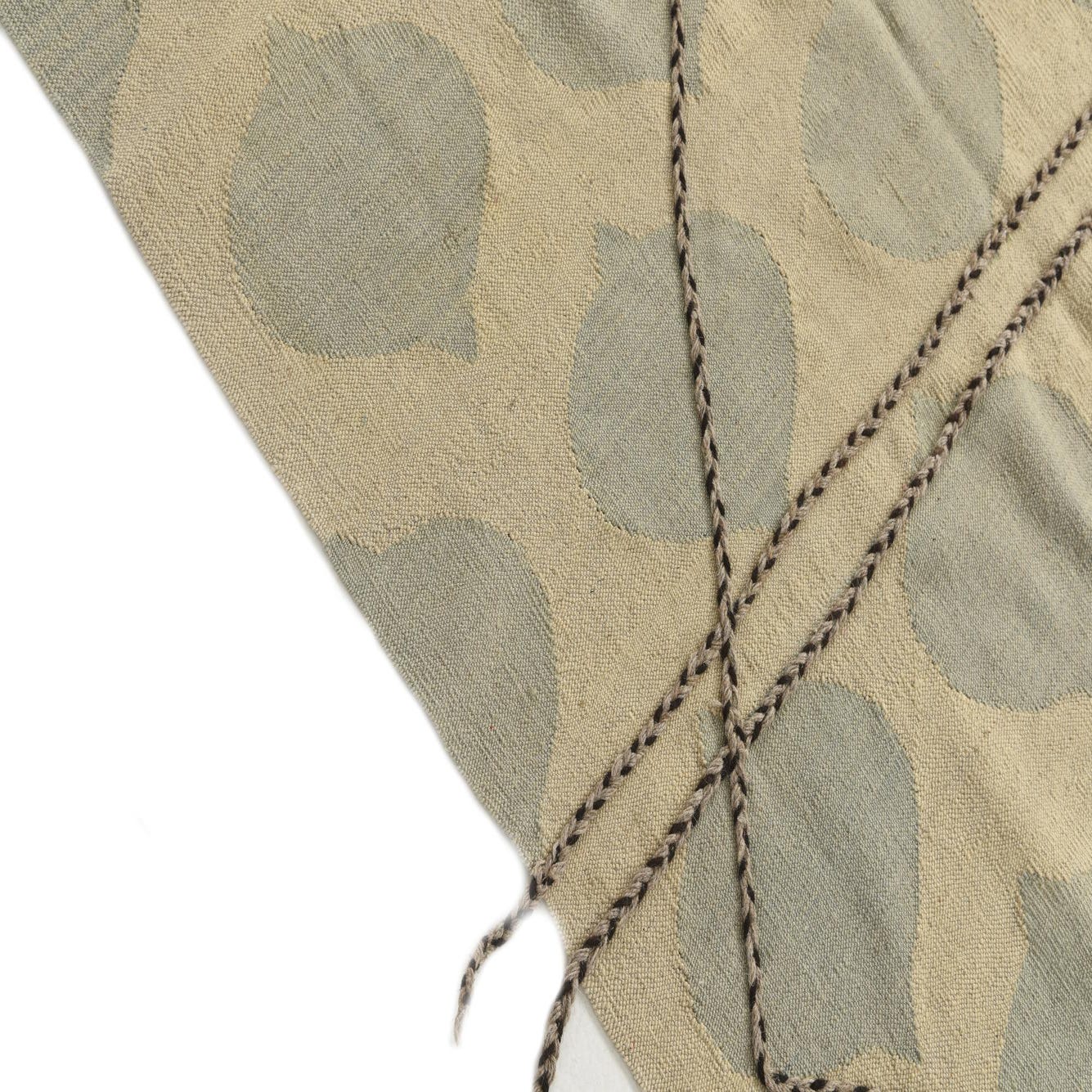 An 8x10 rectangular flatweave wool rug with an ivory background and light blue-green abstract tribal patterns, accented by dark brown braided lines forming a diamond grid.