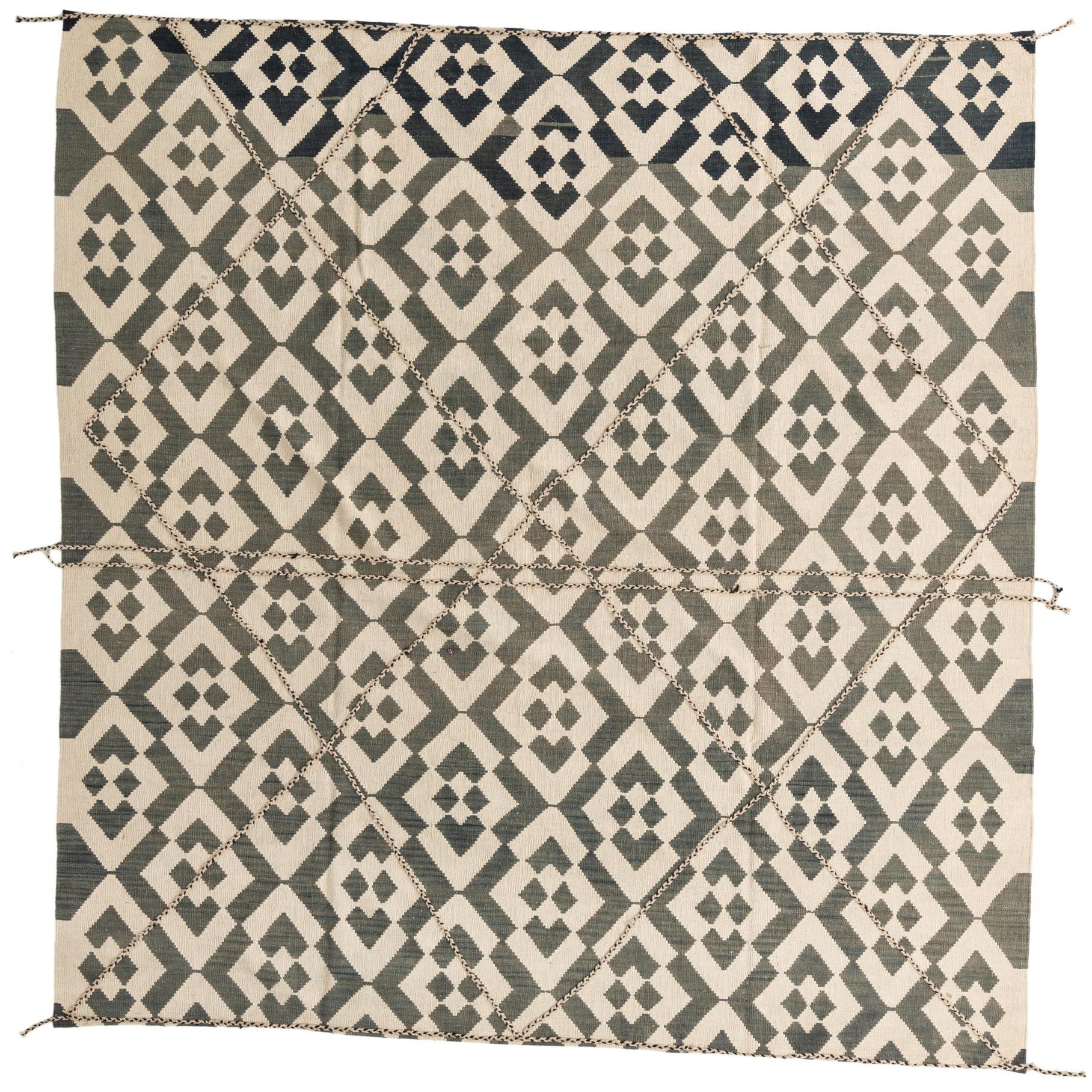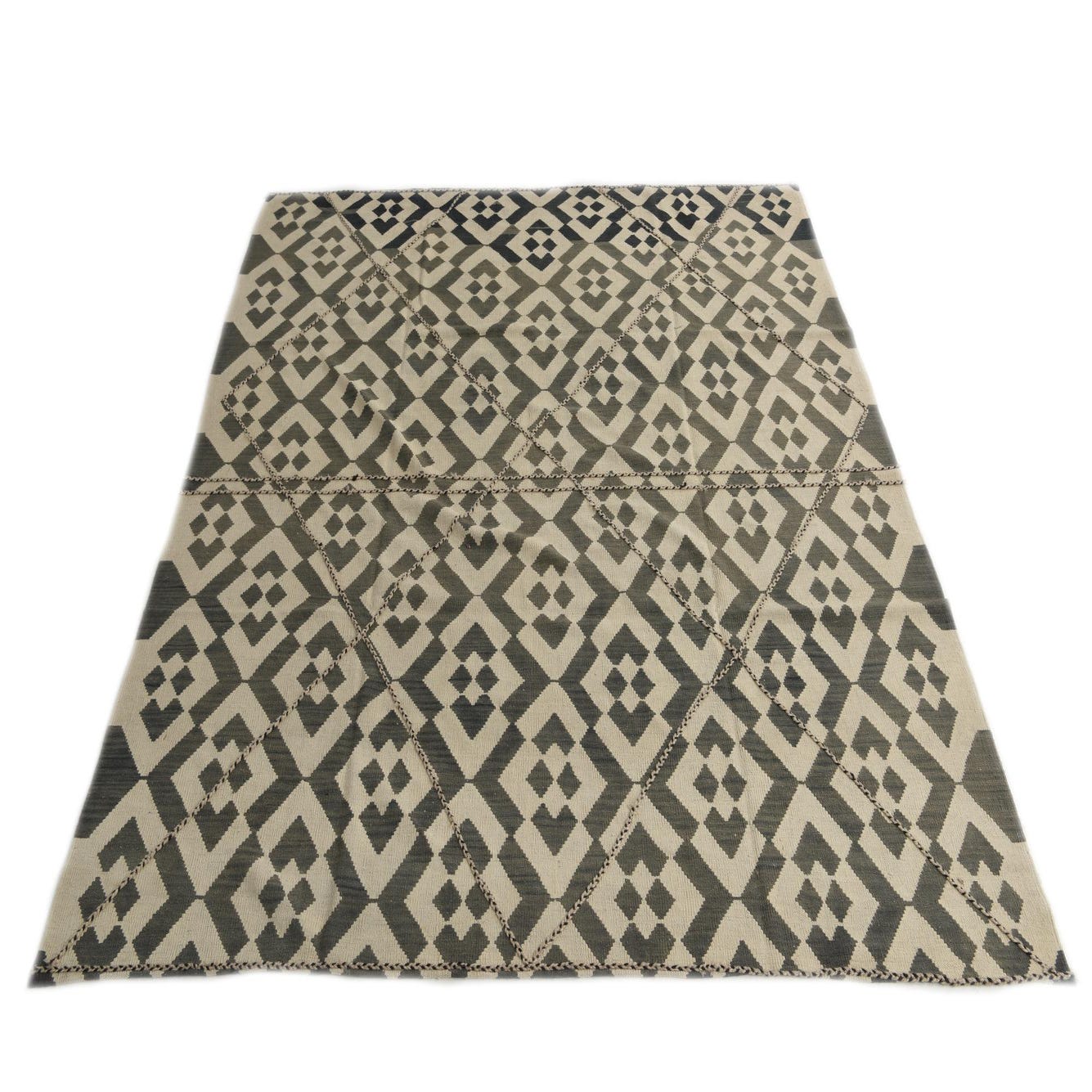 The Kilim Modern 8x10 rug is a hand-woven piece crafted from 100% wool, offering both durability and tactile pleasure underfoot. The design features a geometric pattern with black motifs outlined in a delicate, contrasting stitch, set against a beige background. The straight lines and repeating shapes give the rug a contemporary edge, while the hand-woven construction adds a touch of artisanal charm.