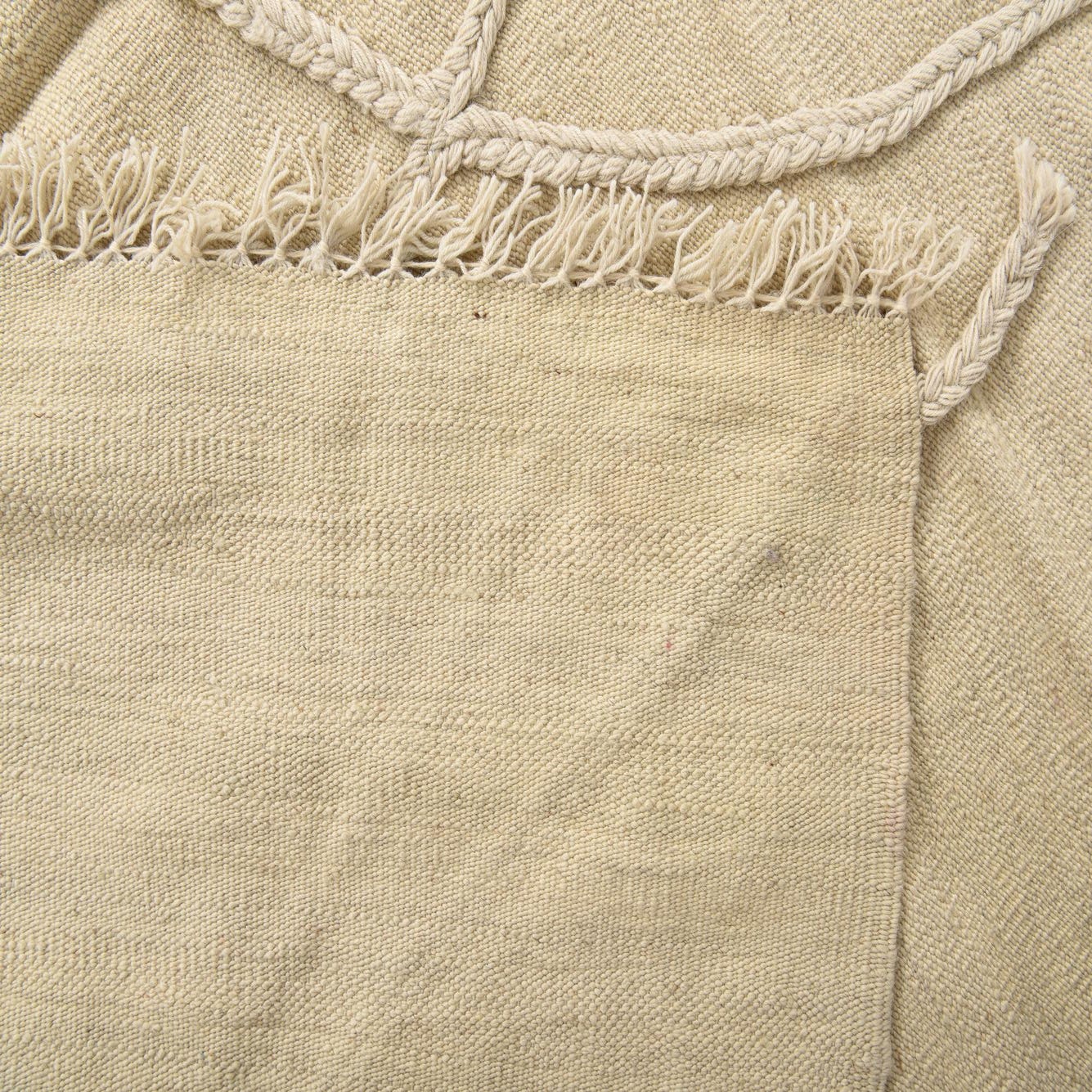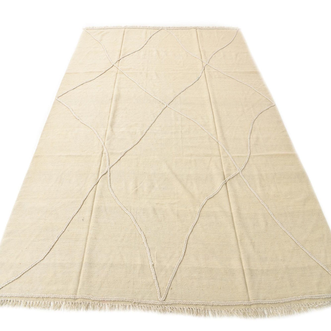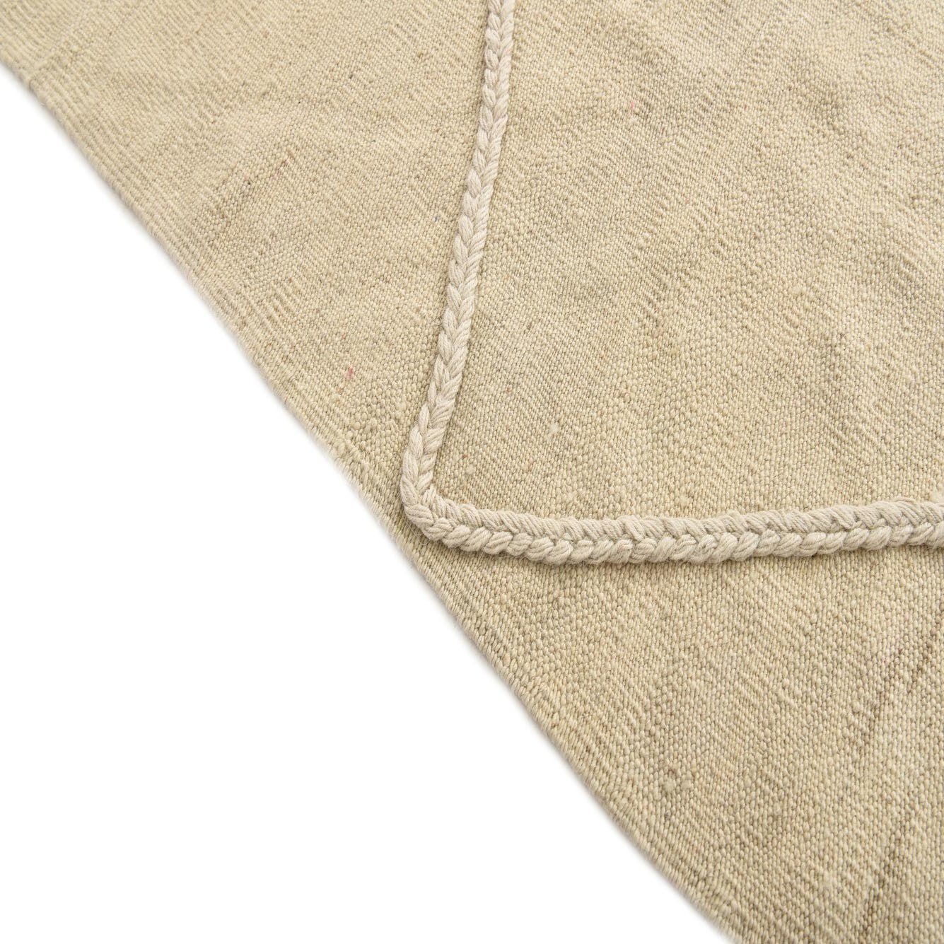 An 8x10 rectangular flatweave wool rug in cream and tan with a subtle tribal geometric pattern.