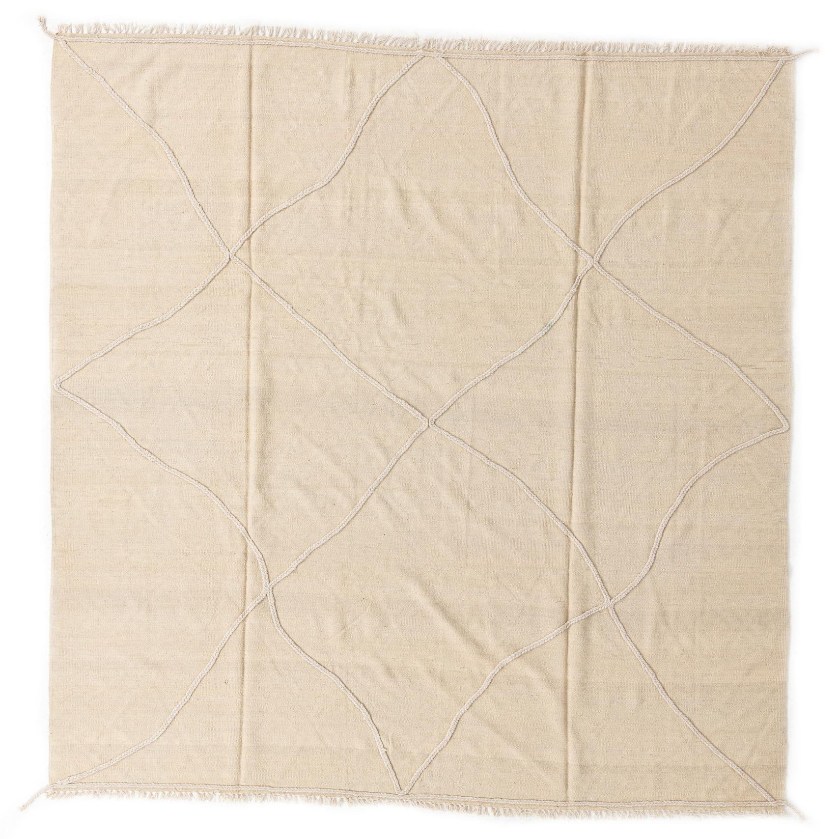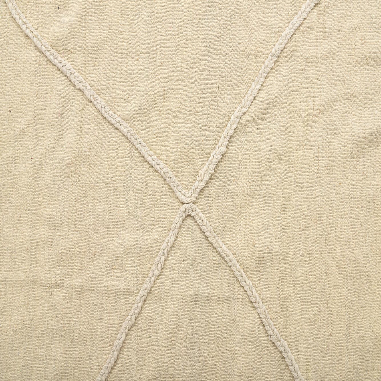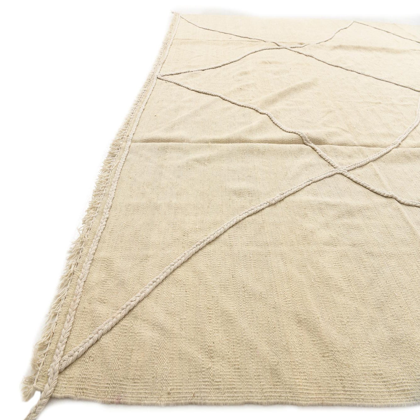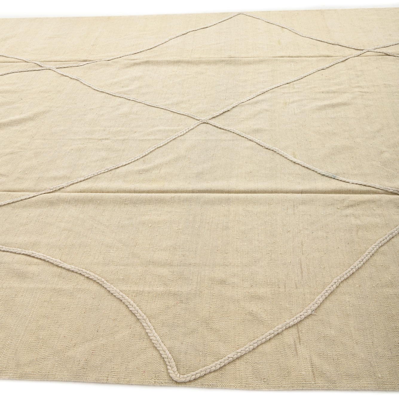 An 8x10 rectangular flatweave wool rug in cream and tan with a subtle tribal geometric pattern.