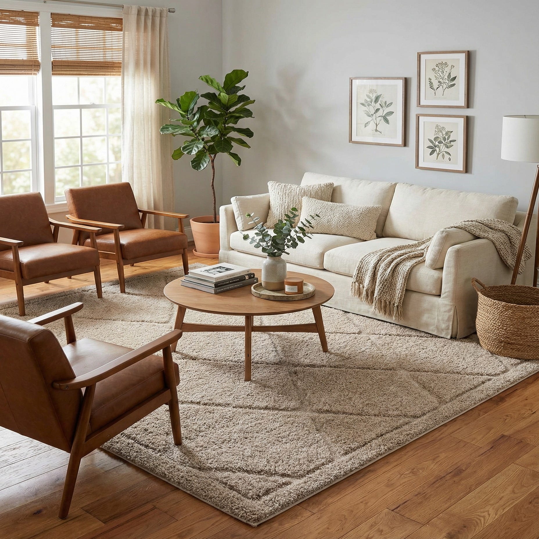 Place this rug beneath a sofa grouping to anchor a living area, layer it in a bedroom for added warmth underfoot, or add it to a family room to soften a high-traffic seating zone. Its neutral tone and restrained geometric pattern pair well with light woods, linen upholstery, and clean-lined furniture—ideal for transitional, contemporary, or modern farmhouse interiors.