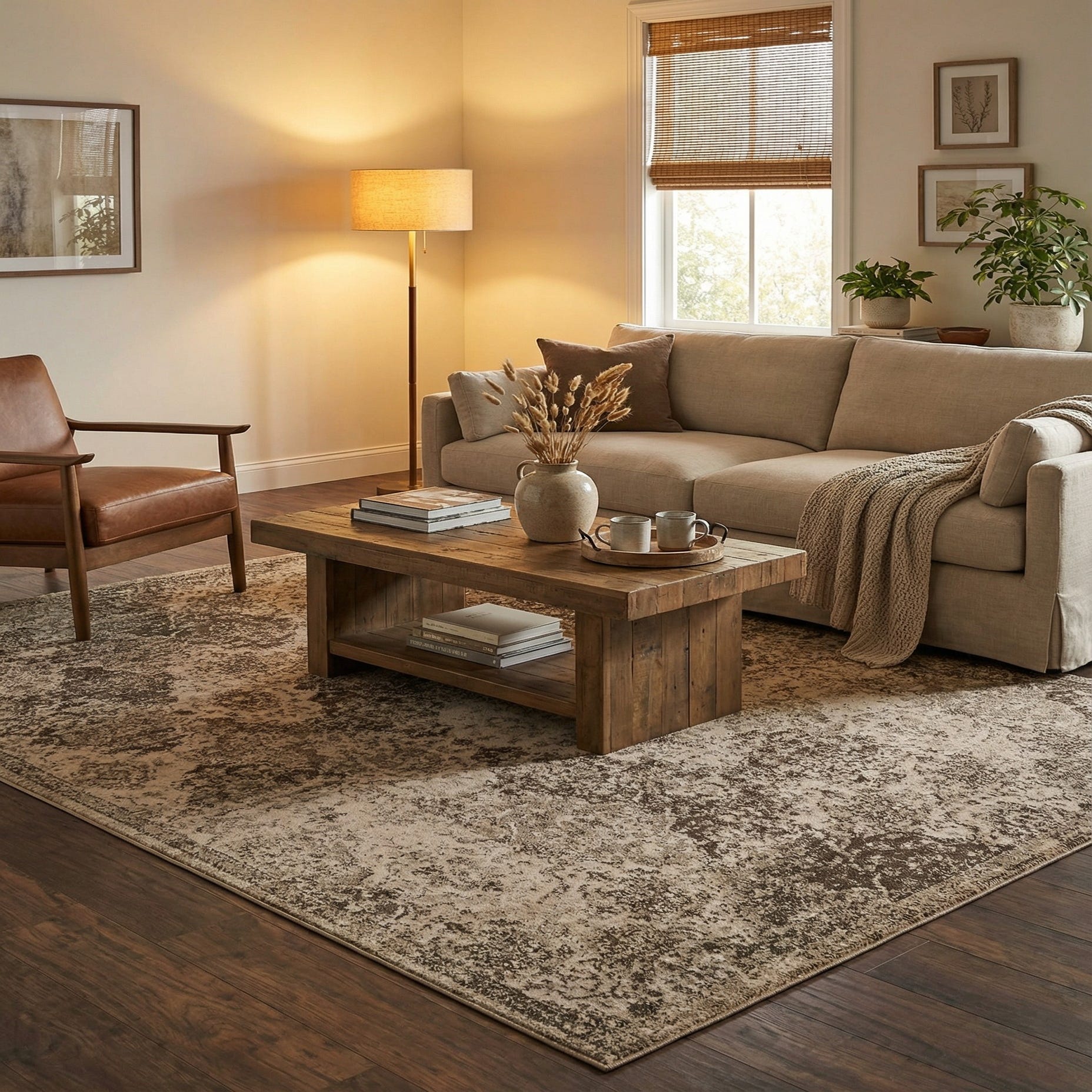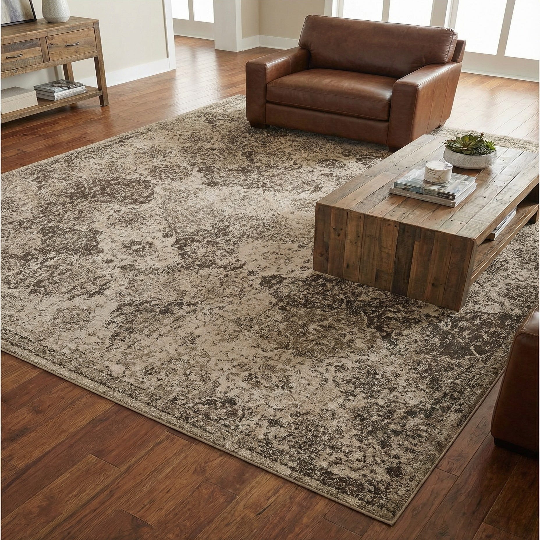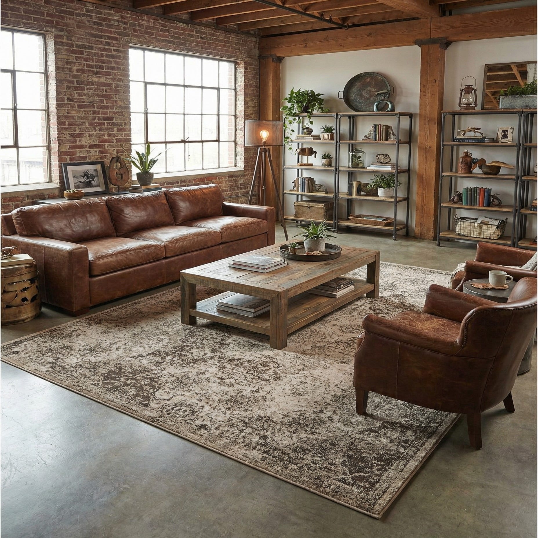 This rug pairs well with warm wood furnishings and leather seating for a classic, grounded feel, or with cool gray upholstery and metal accents in a more contemporary, industrial setting. It also complements neutral, Scandinavian-leaning rooms when layered over hardwood or tile, and can anchor a seating area or define a dining space without overpowering other decor.