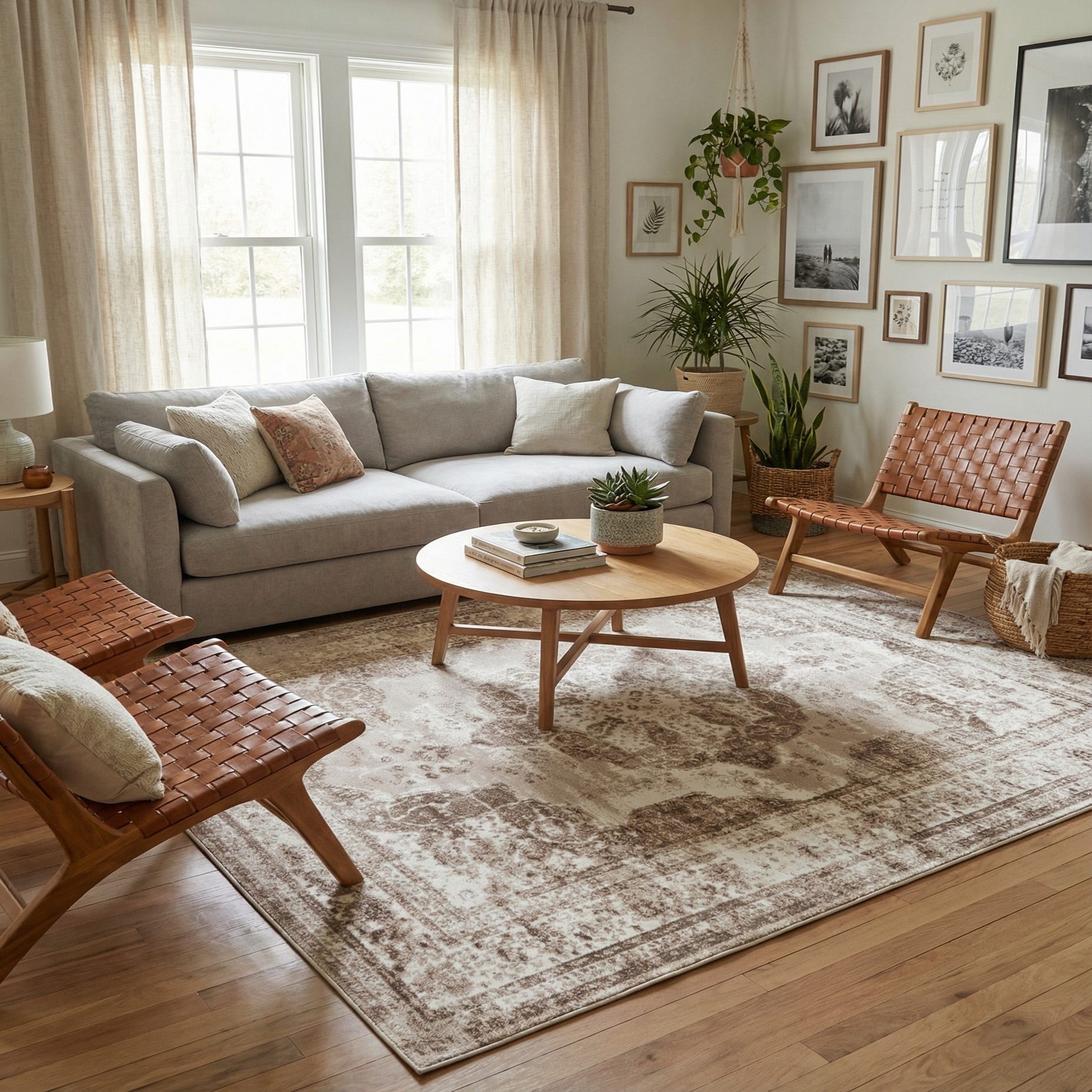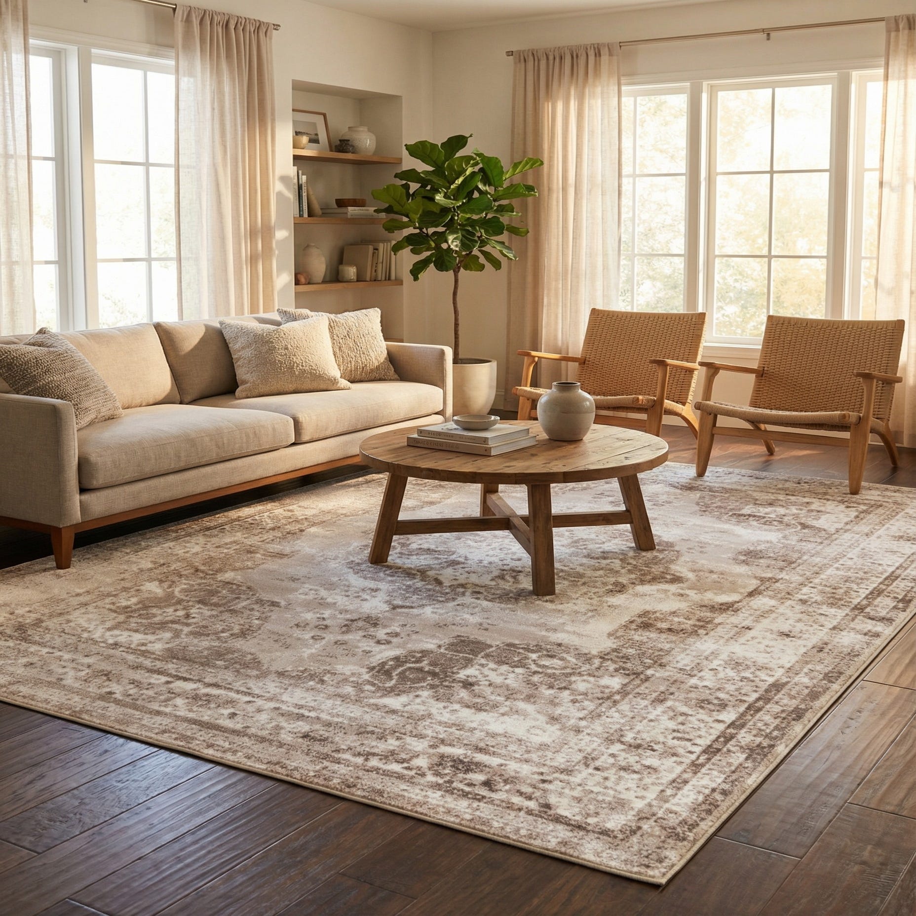 Place this rug under a coffee table to anchor a seating area, beneath a dining table to introduce quiet patterning, or at the foot of a bed to add warmth and texture. It pairs well with warm wood furniture, leather or linen upholstery, and soft metallic accents, fitting nicely in transitional, modern farmhouse, or classic-traditional interiors where a neutral, textural foundation is desired.