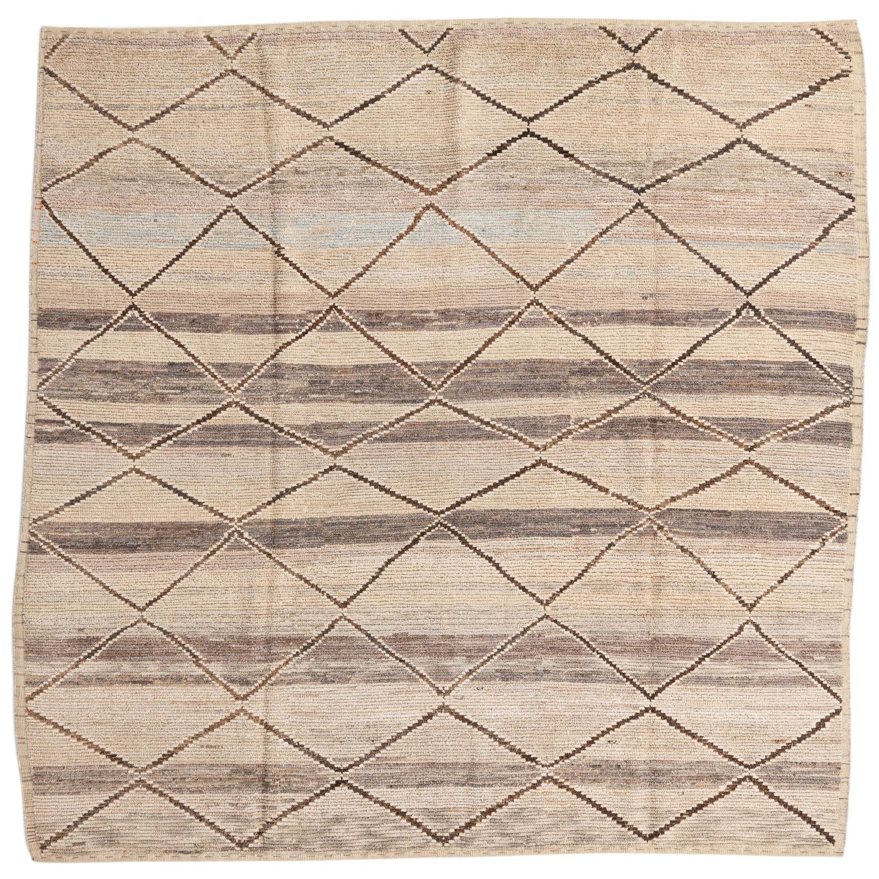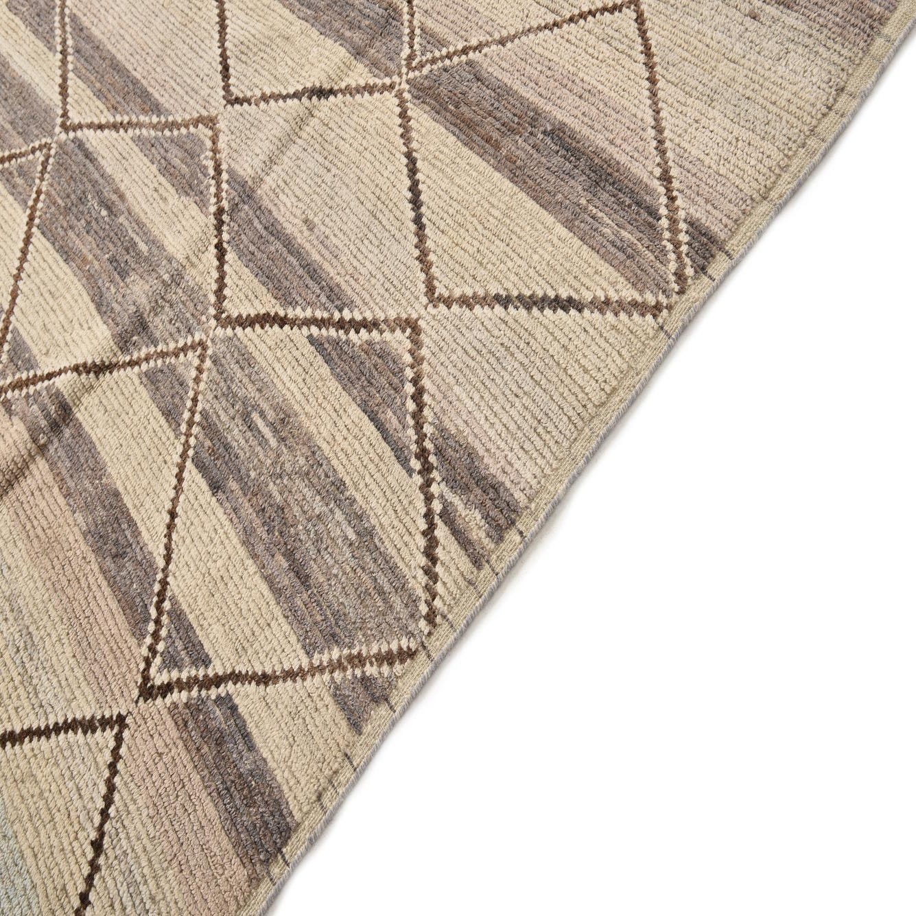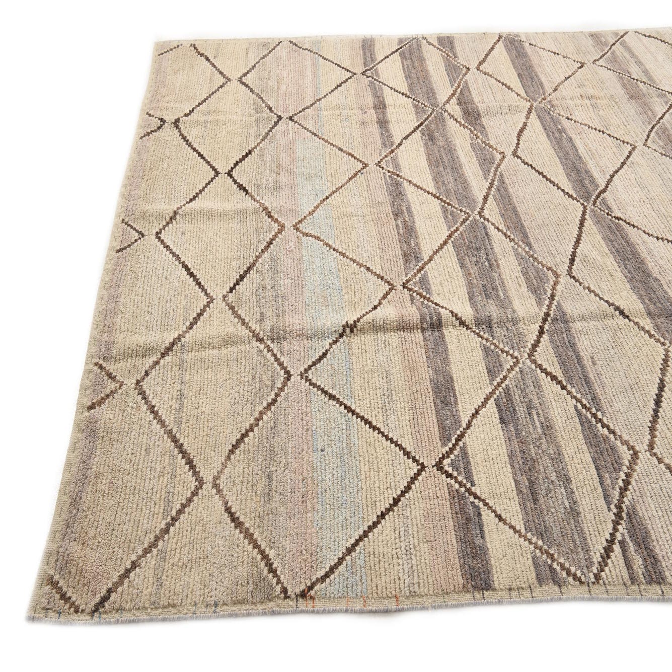 A soft beige field provides a warm, neutral backdrop for a hand-knotted 100% wool weave patterned with a relaxed diamond lattice in warm brown. Horizontal bands of gray and light brown run across the field, creating a layered, slightly weathered look that adds depth without dominating the room. The wool construction gives the surface a natural, tactile finish with gentle variations in tone and texture where each knot meets the next, so the rug feels inviting underfoot while maintaining a refined, understated appearance.