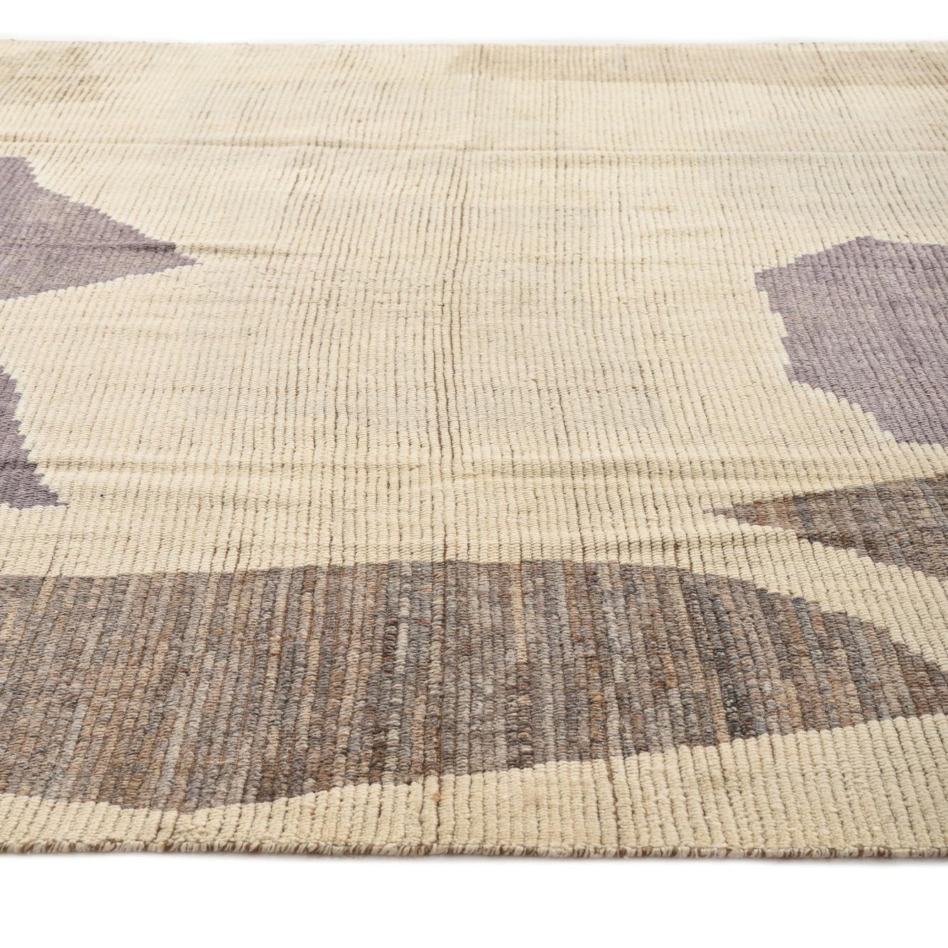 An 8x10 rectangular shag rug with an abstract tribal pattern in ivory, brown, and purple tones, suitable for a modern living room.