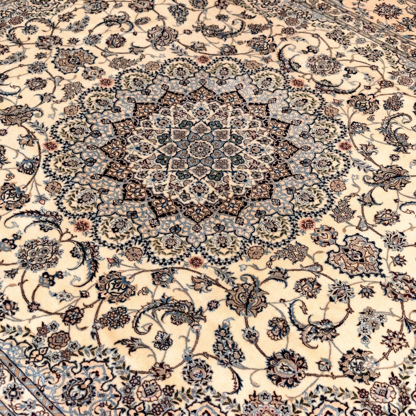 An 8x10 rectangular Persian rug in cream and brown, featuring a detailed floral medallion and border.