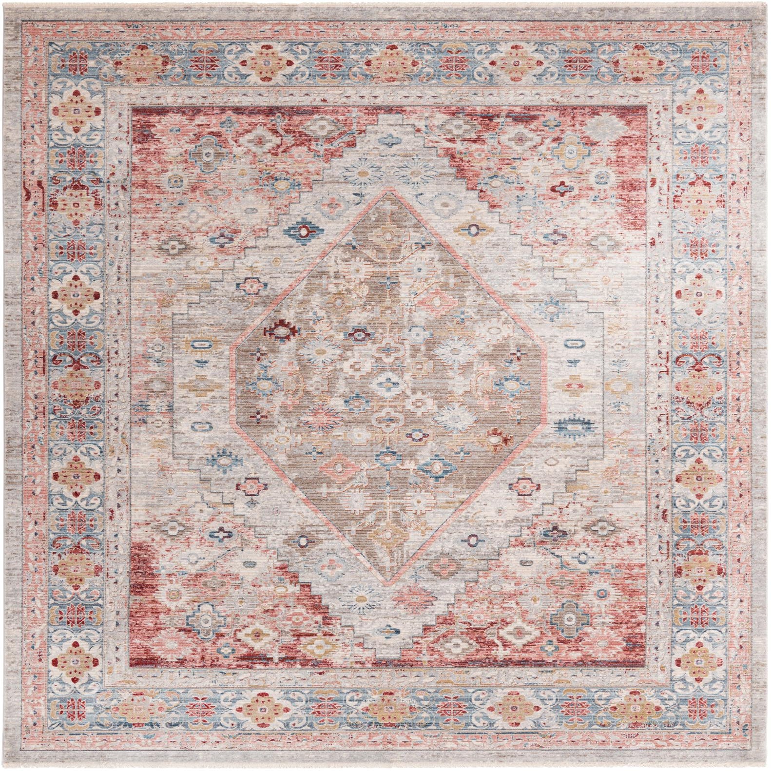 Primary color is Beige. Colors in this rug include: Beige, Blue, Gray, Ivory, Red, Rust Red, Burgundy, Light Blue.