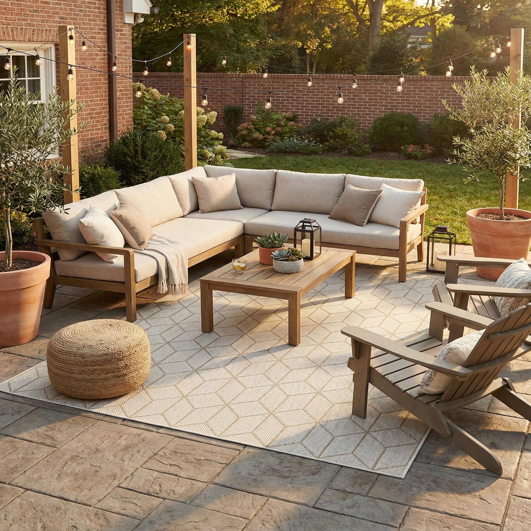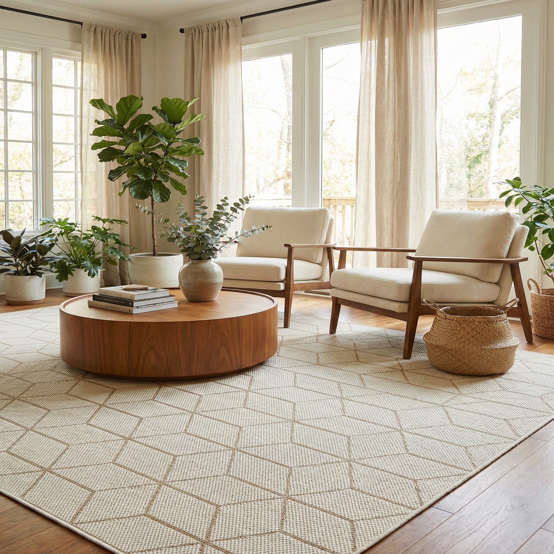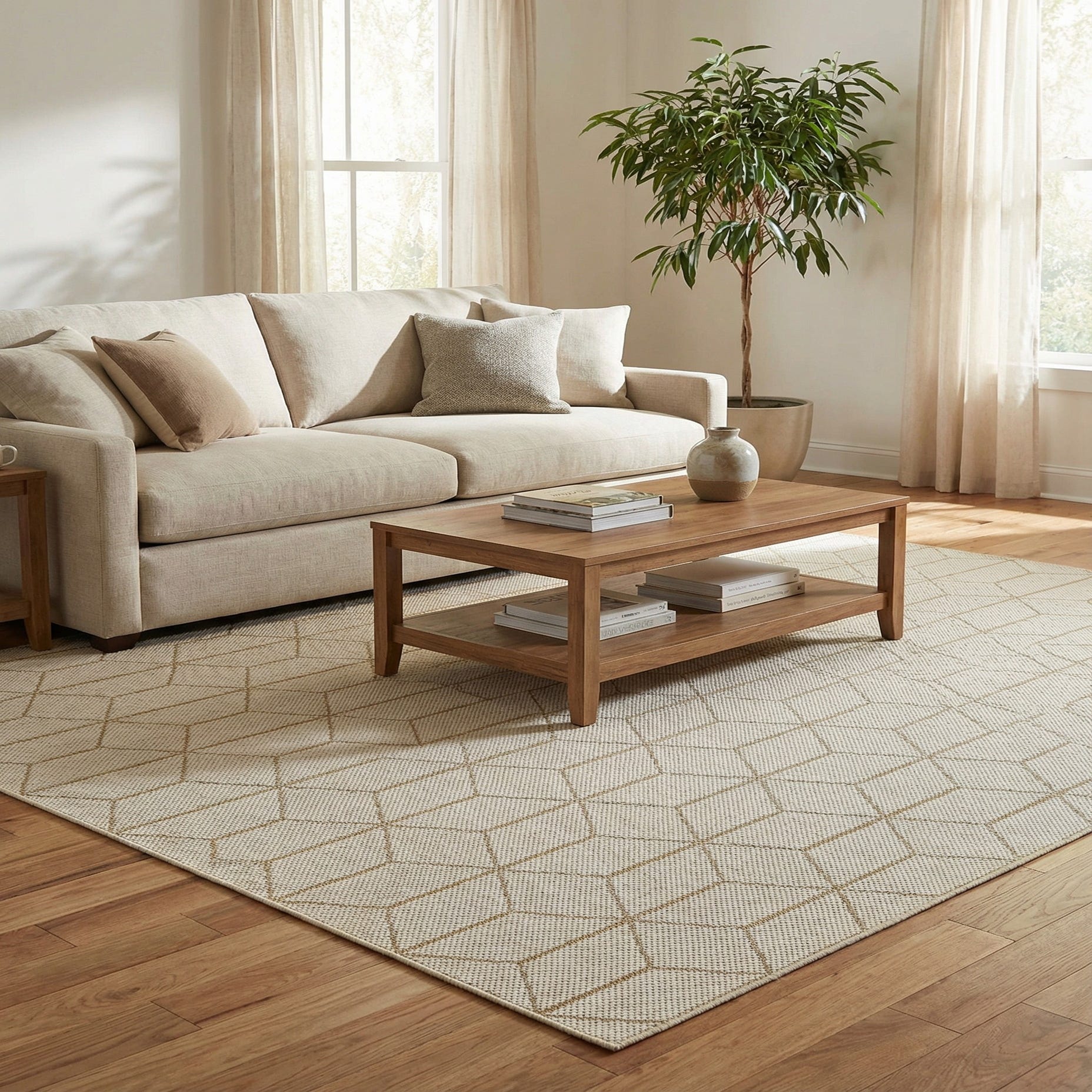This rug would harmonize well with a minimalist, modern, or coastal-inspired decor due to its clean lines and understated color palette. It would complement spaces that emphasize natural light and open layouts, such as sunrooms, covered patios, or chic living rooms with large windows. The neutral beige background also makes it a perfect candidate for pairing with bolder furniture pieces, acting as a grounding element within a vibrant design scheme.