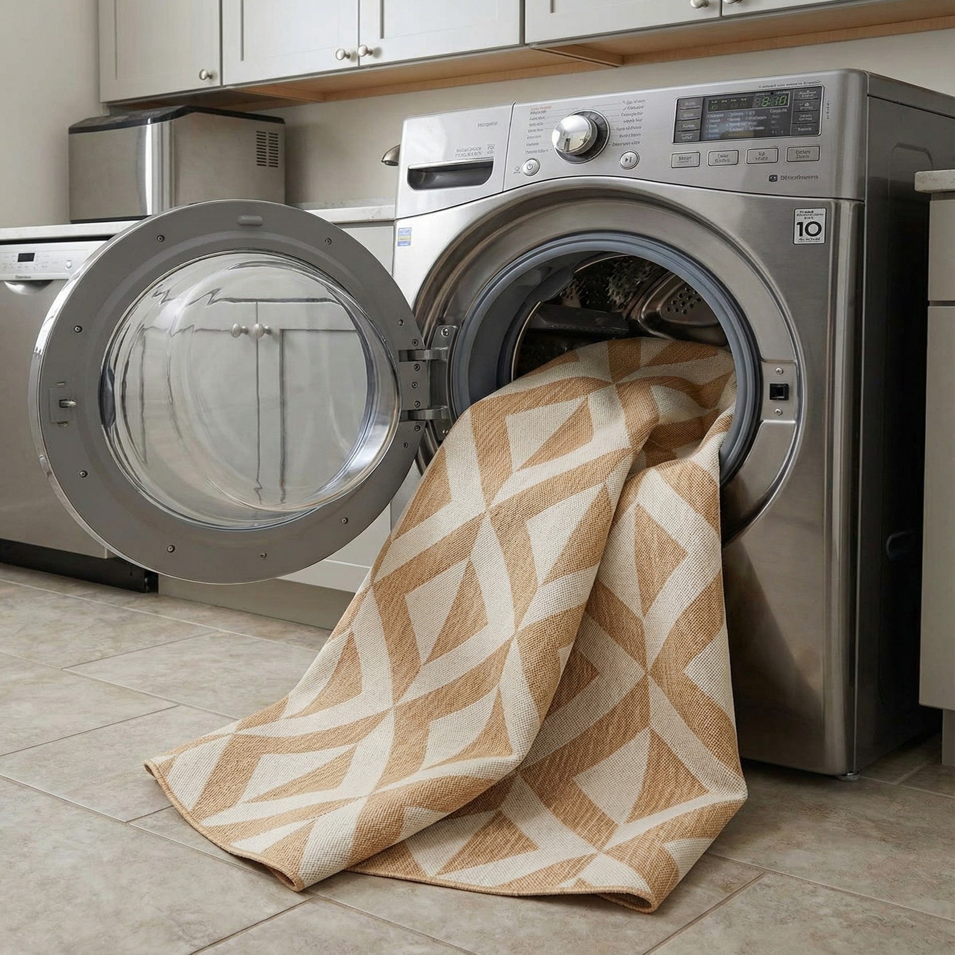 Place this rug on a covered patio or sunroom to anchor a casual seating area, or use it beneath a round dining table to introduce pattern without overwhelming a bright space. It also works well in an entry, breezy coastal living room, or layered over a neutral jute for added visual interest. The neutral beige and brown palette makes it easy to pair with natural woods, wicker, and muted linens for a warm, approachable look.